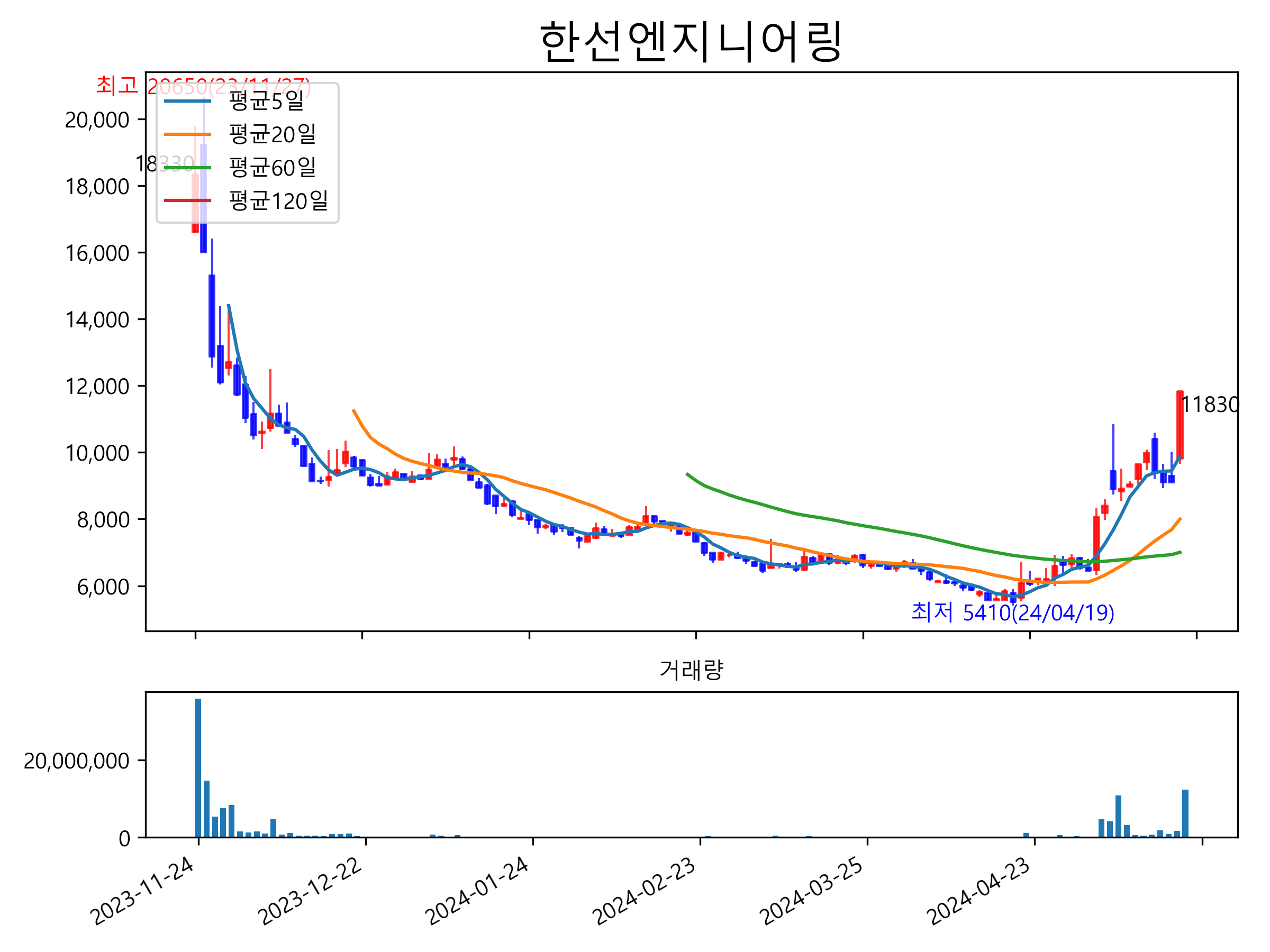 최근 6개월간 캔들차트 및 이동평균선입니다.