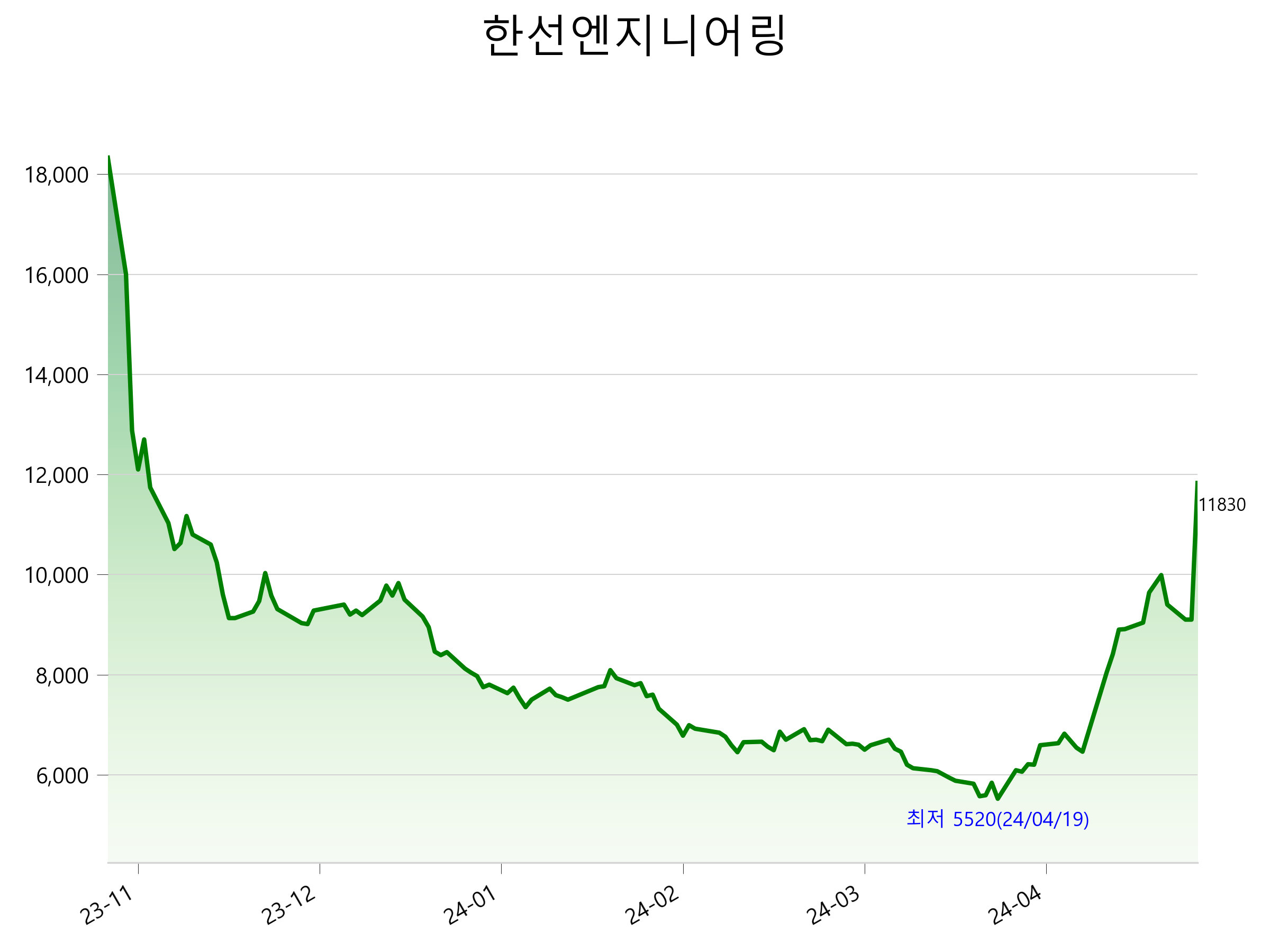 52주 최고가는 18,330원(2023-11-24), 52주 최저가는 5,520원(2024-04-19)으로 52주간 주가 상승률은 -35.5% 입니다.