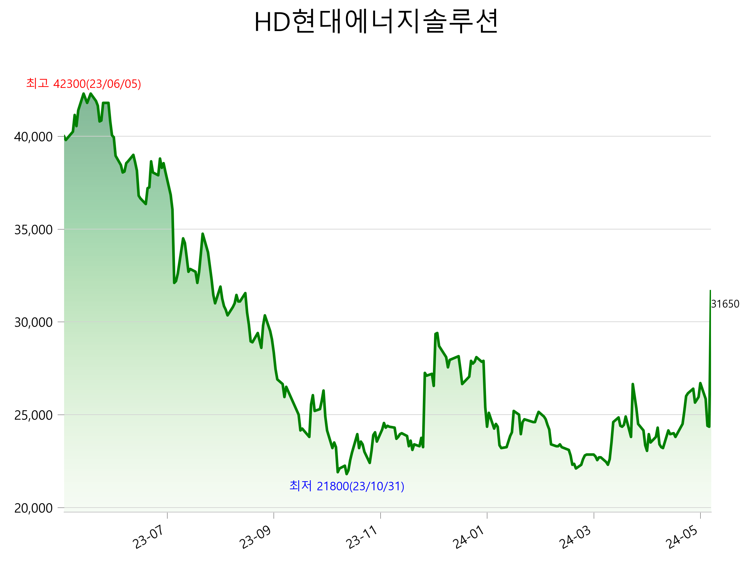 5월 23일 기준 주가는 31,650원 입니다. 아래는 최근 1년간의 주가흐름입니다.