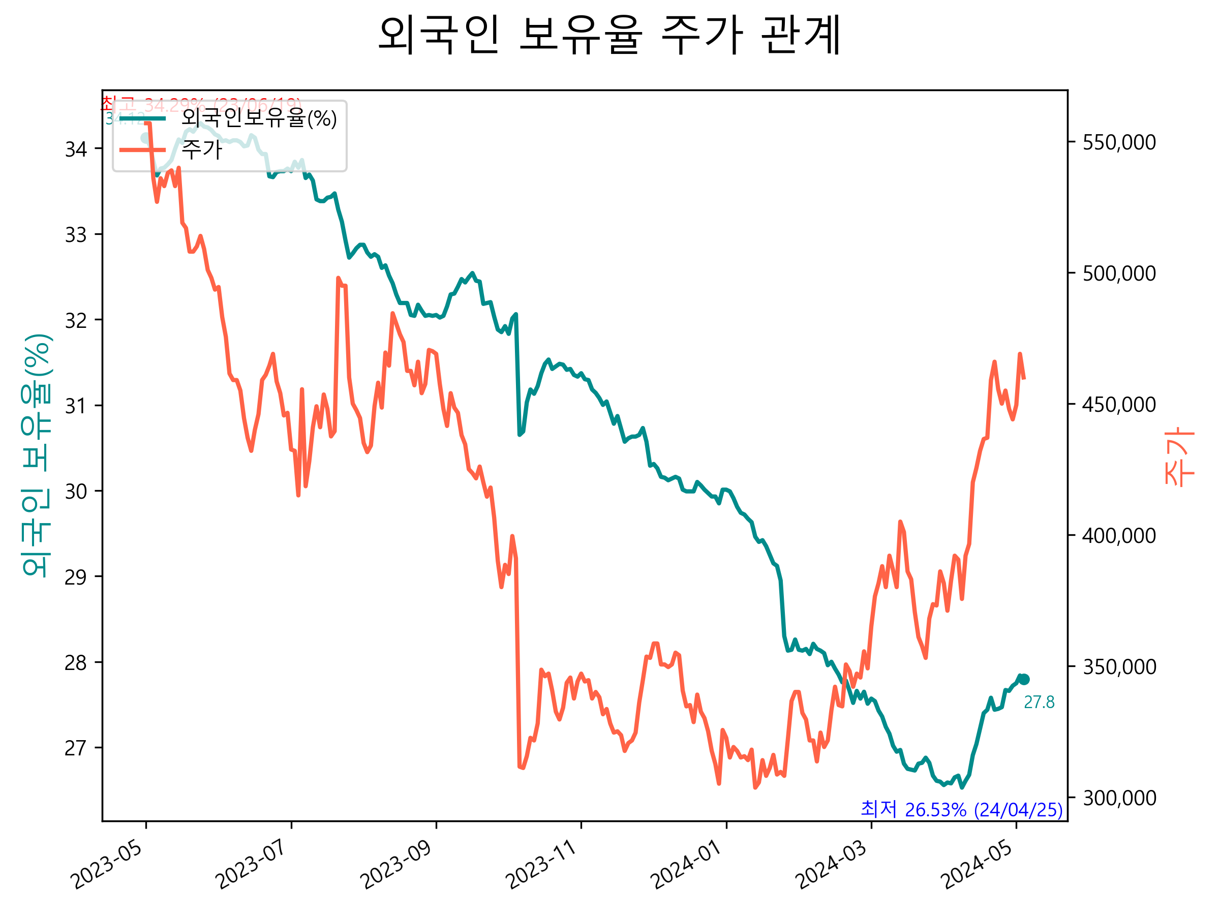 최근 1년간 외국인 보유율 및 주가와의 관계입니다.