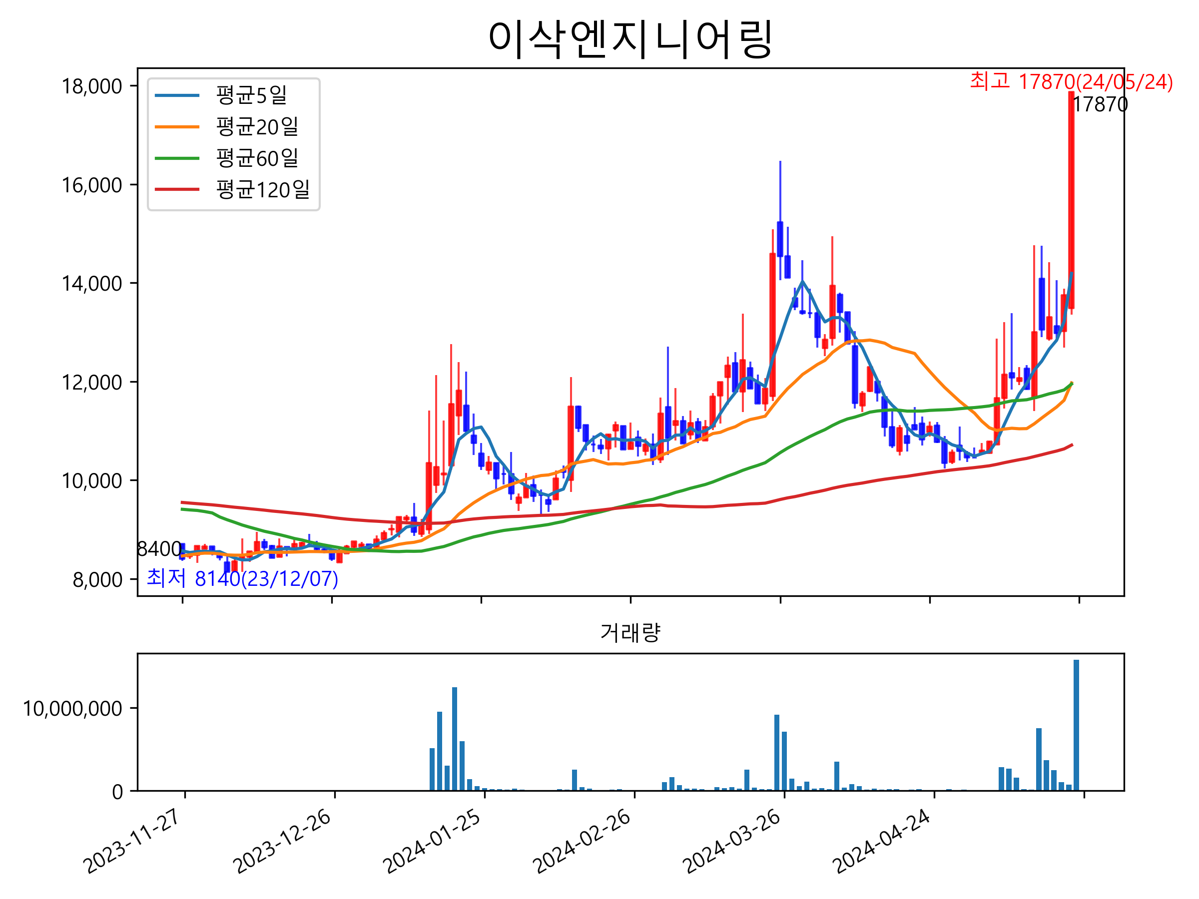 최근 6개월간 캔들차트 및 이동평균선입니다.