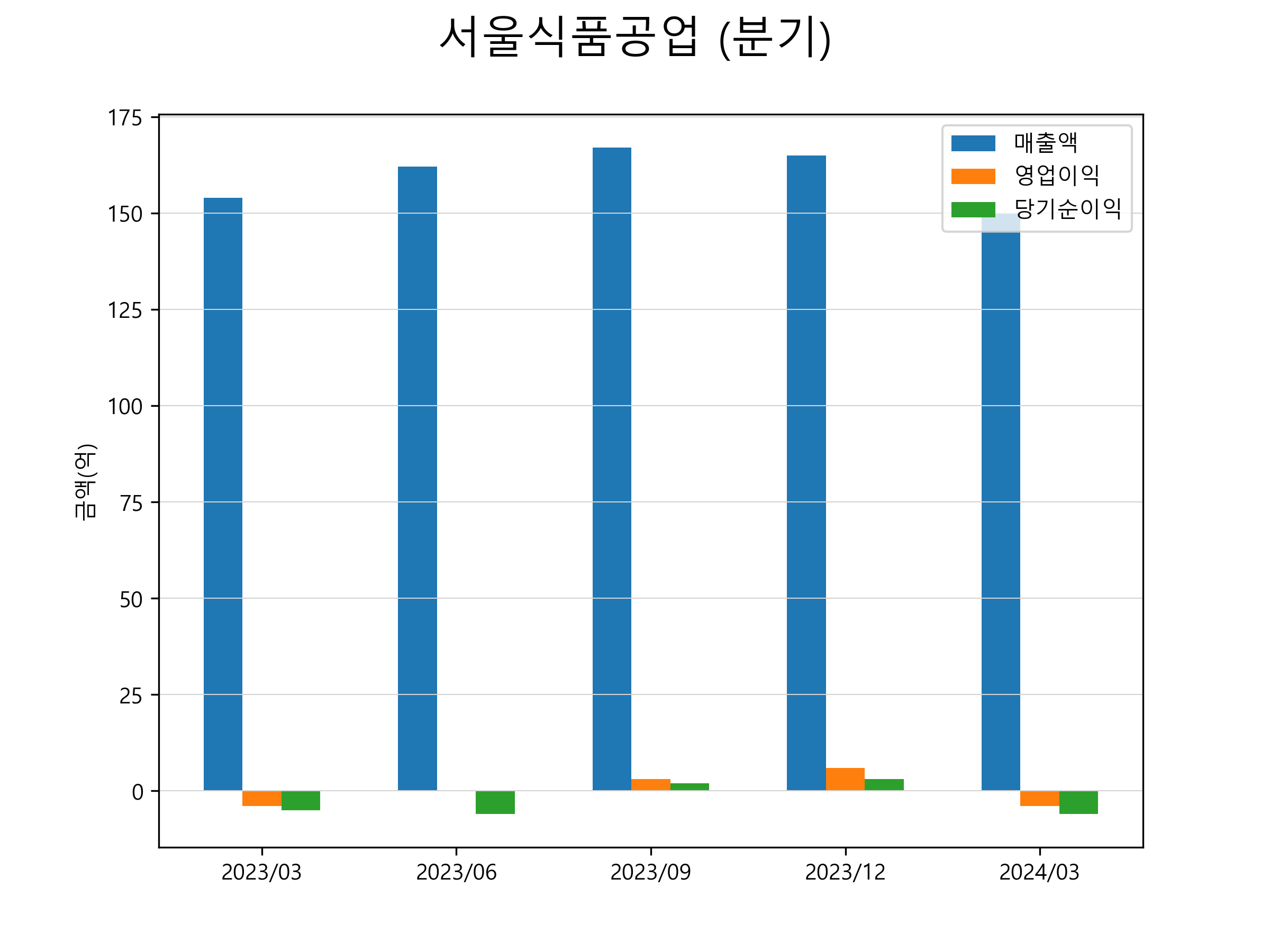 서울식품의 2024년 1분기 매출은 150억원, 영업손실 -4억원, 당기순손실 -6억원을 기록했습니다. 분기별 매출 및 영업이익, 당기순이익 표입니다.