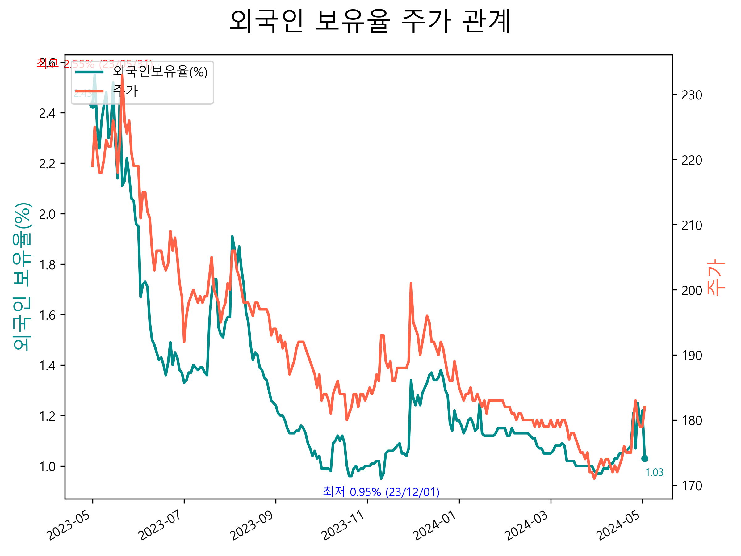 최근 1년간 외국인 보유율 및 주가와의 관계입니다.