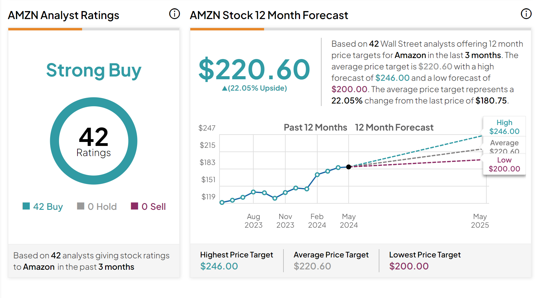 팁랭크스(Tipranks)에서 아마존의 투자의견입니다. 지난 3개월 동안 총 42명의 애널리스트가 목표가를 추정하였습니다. 목표주가는 $220.60로 현재주가 $180.75보다 22.05% 상승할 것으로 전망했습니다. 가장 높은 목표주가는 $246.00이며, 가장 낮은 목표주가는 $200.00입니다.