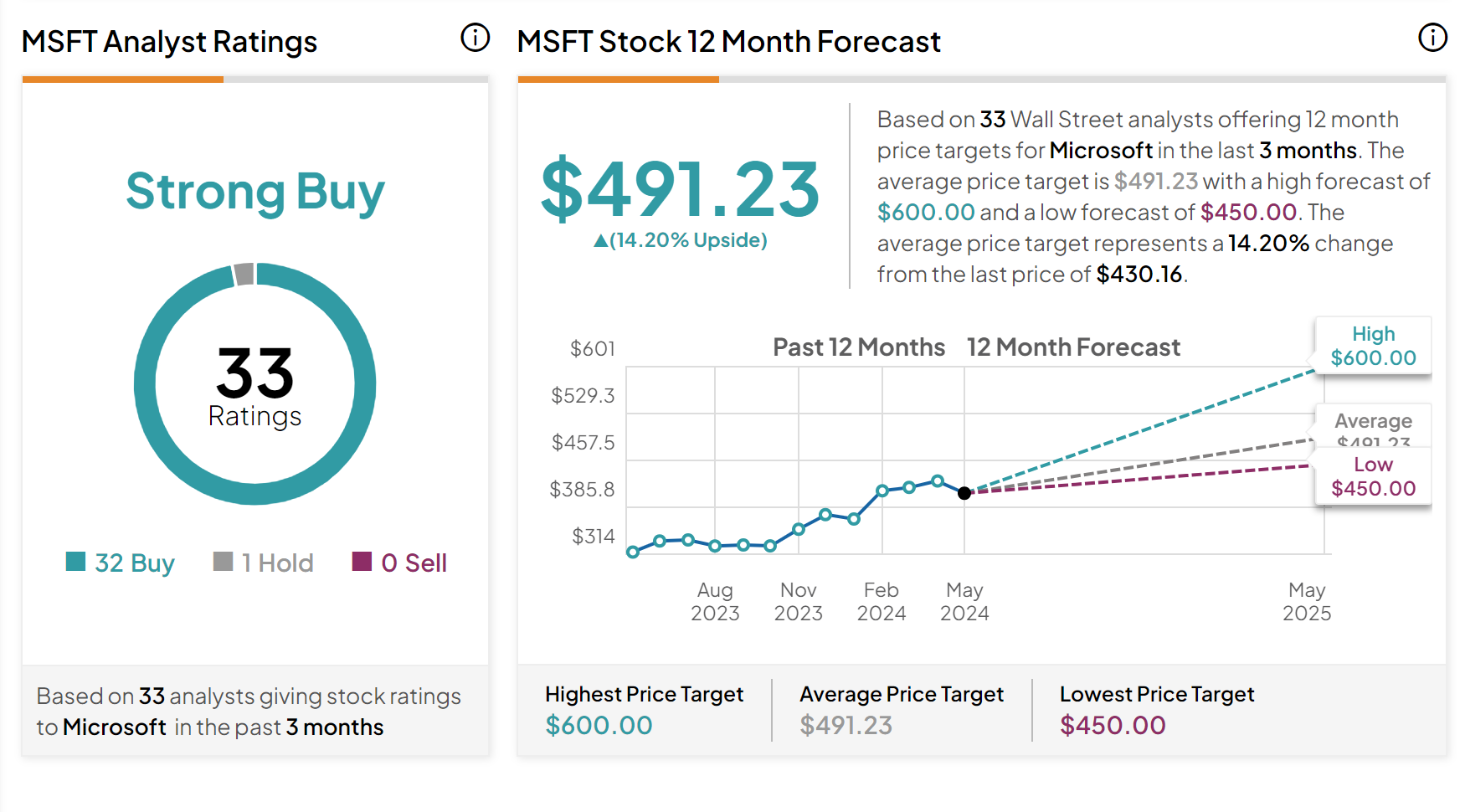 팁랭크스(Tipranks)에서 마이크로소프트의 투자의견입니다. 지난 3개월 동안 총 33명의 애널리스트가 목표가를 추정하였습니다. 목표주가는 $491.23로 현재주가 $430.16보다 14.20% 상승할 것으로 전망했습니다. 가장 높은 목표주가는 $600.00이며, 가장 낮은 목표주가는 $450.00입니다.