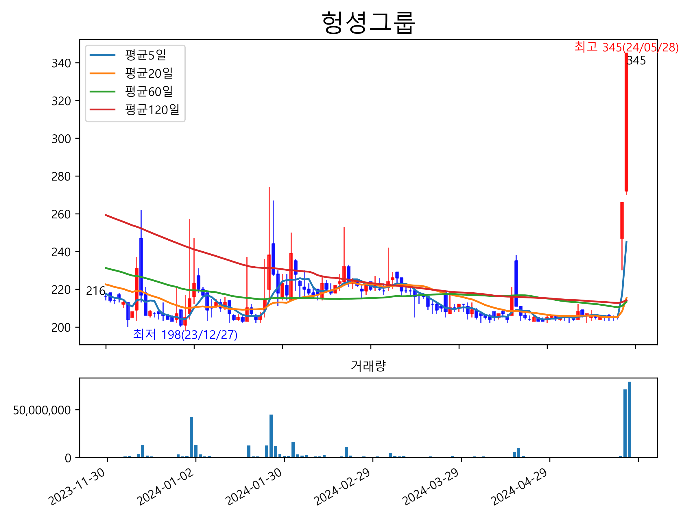 최근 6개월간 캔들차트 및 이동평균선입니다.