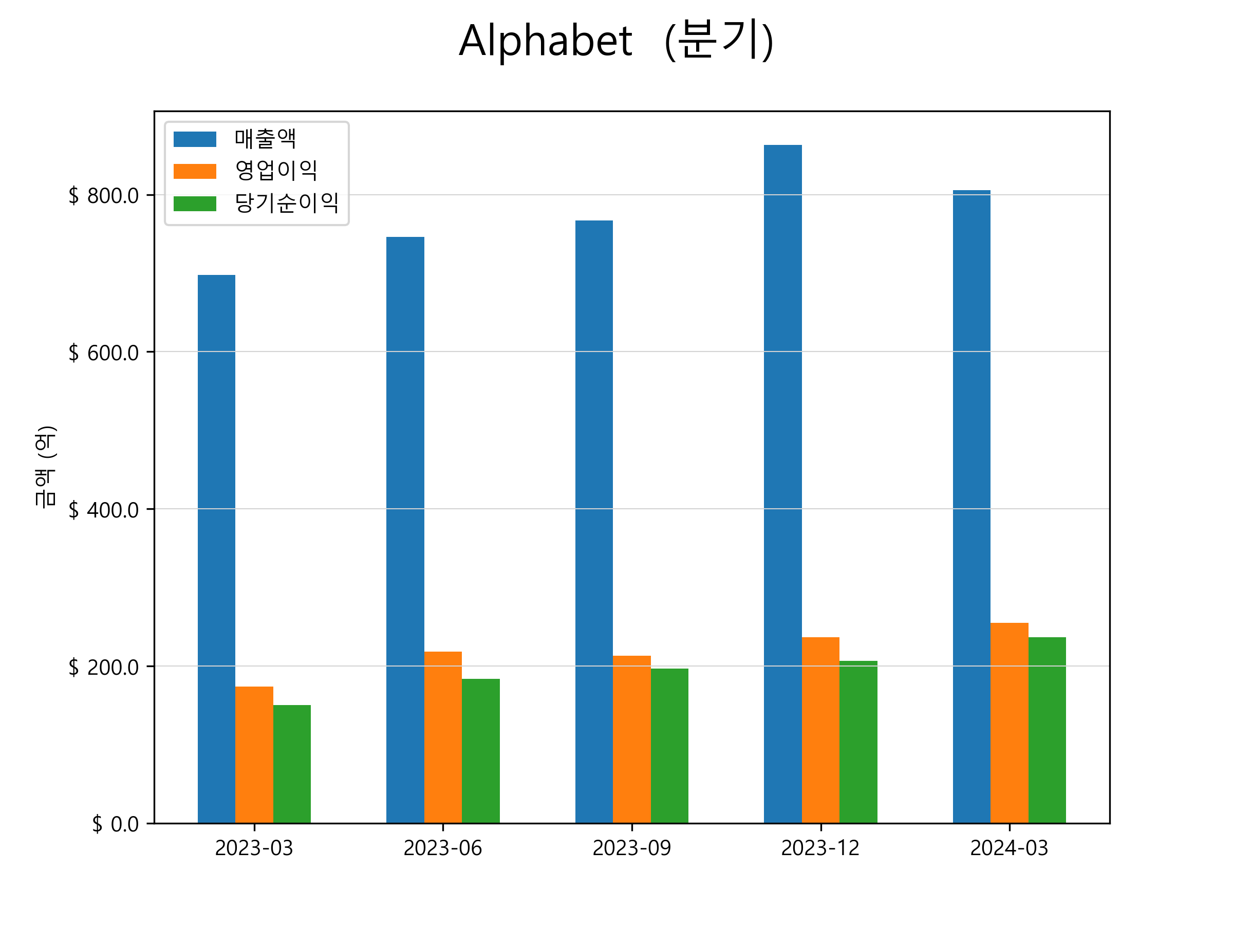 알파벳 의 2024년 1분기 매출은 805.4억달러(약 109조 4941억원), 영업이익 254.7억달러(약 34조 6265억원), 당기순이익 236.6억달러(약 32조 1658억원)을 기록했습니다. 분기별 매출 및 영업이익, 당기순이익 표입니다.
