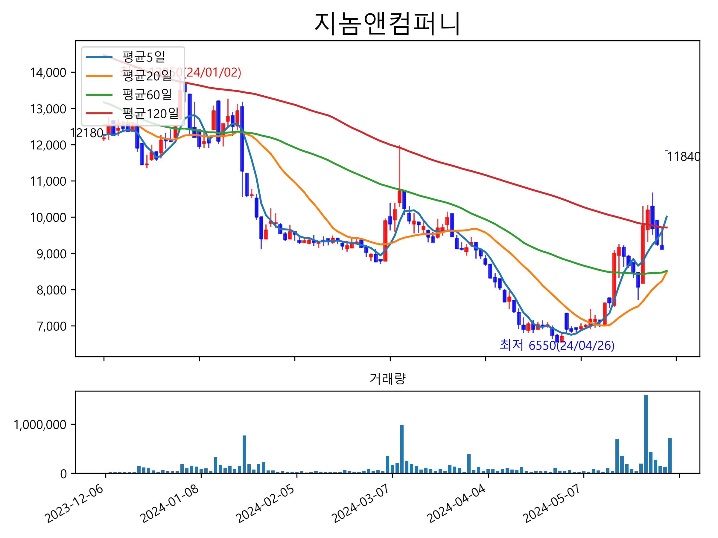 최근 6개월간 캔들차트 및 이동평균선입니다.