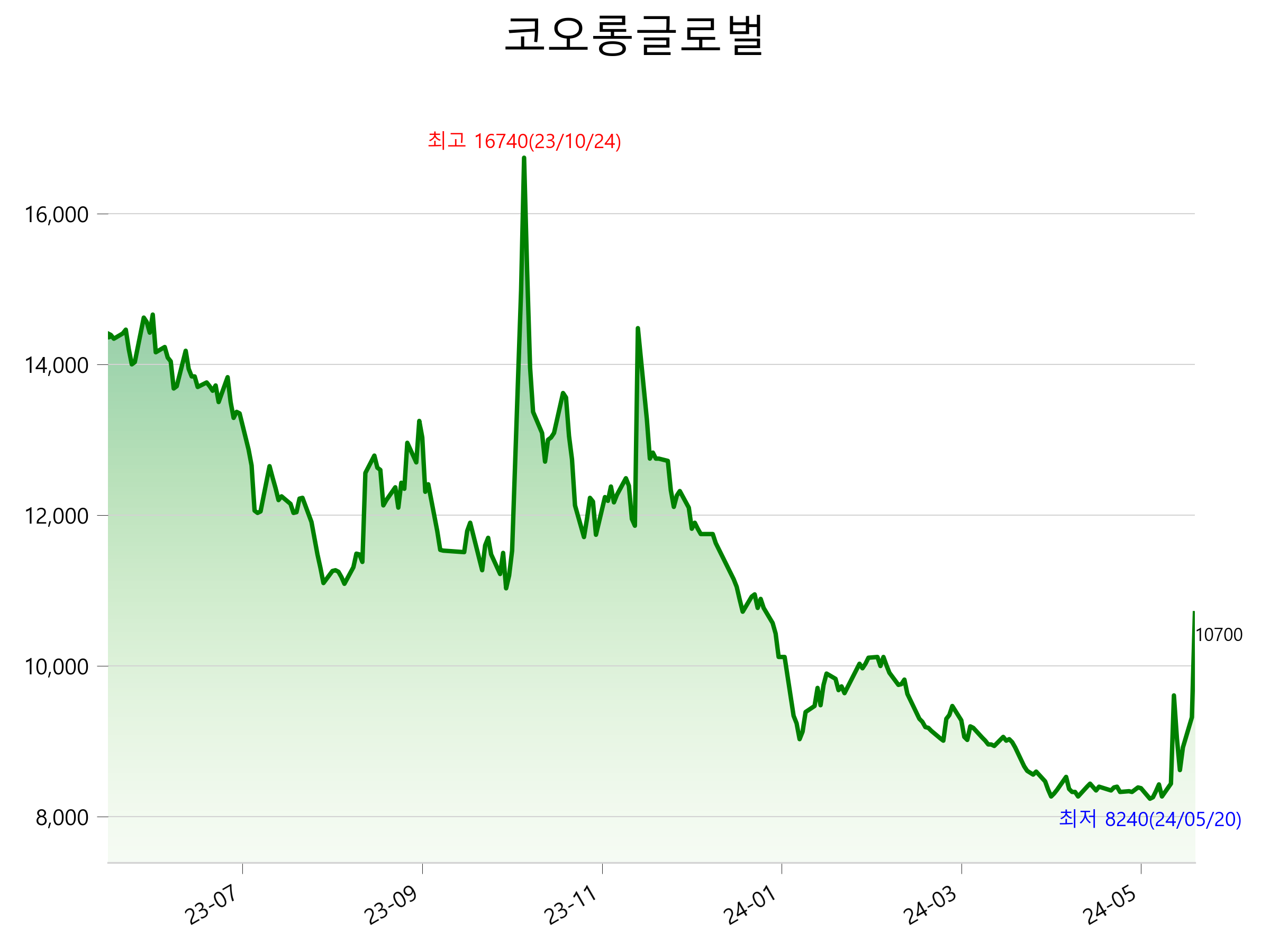 52주 최고가는 16,740원(2023-10-24), 52주 최저가는 8,240원(2024-05-20)으로 52주간 주가 상승률은 -25.7% 입니다.