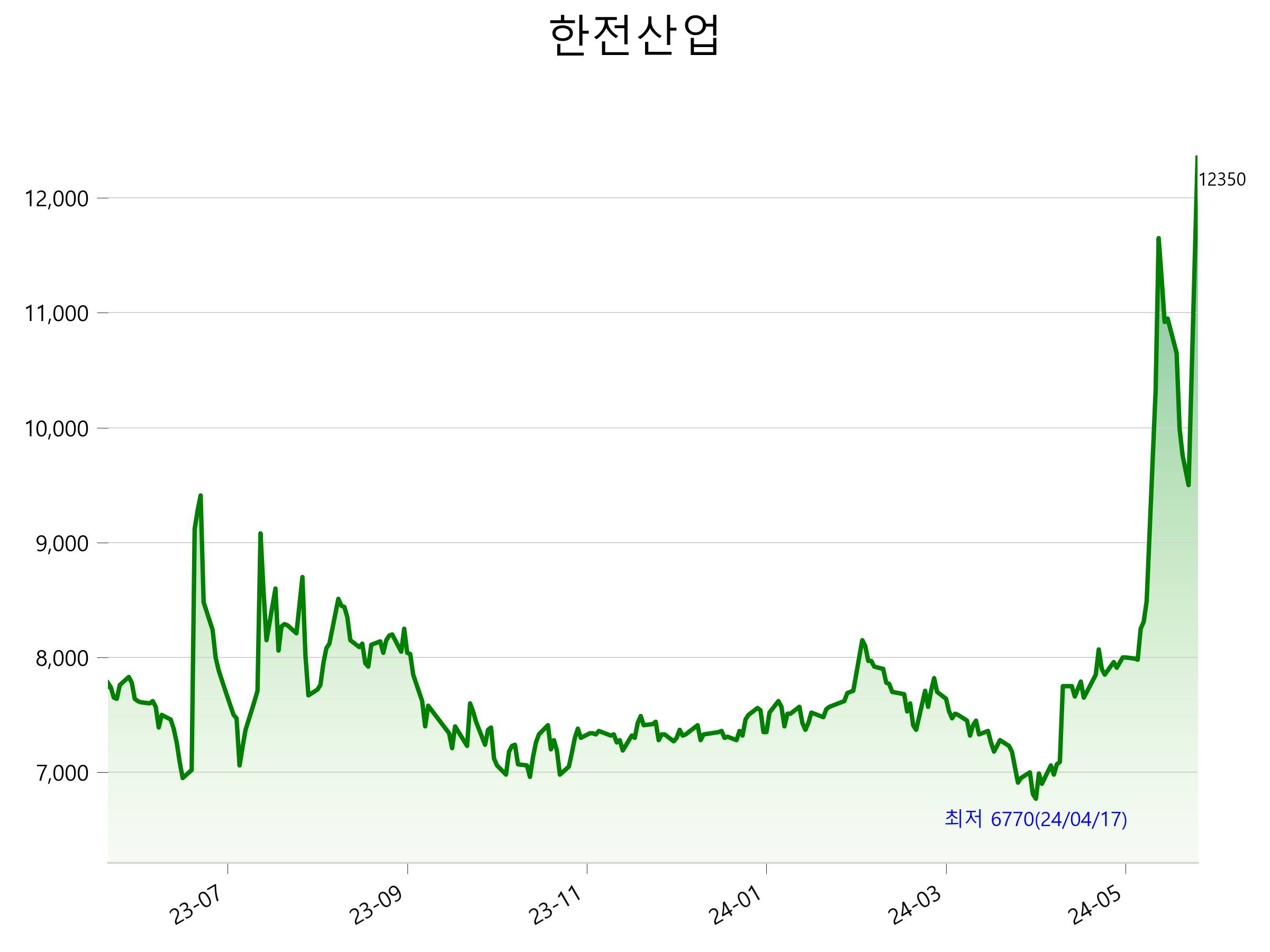 52주 최고가는 12,350원(2024-06-10), 52주 최저가는 6,770원(2024-04-17)으로 52주간 주가 상승률은 58.7% 입니다.