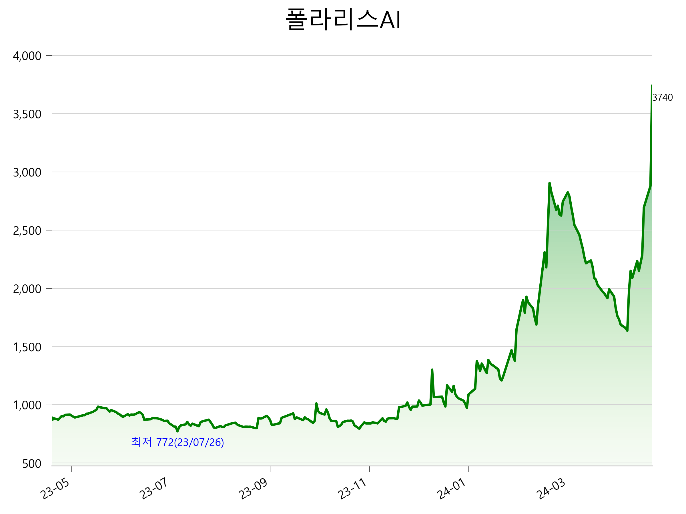 52주 최고가는 3,740원(2024-05-08), 52주 최저가는 772원(2023-07-26)으로 52주간 주가 상승률은 319.8% 입니다.