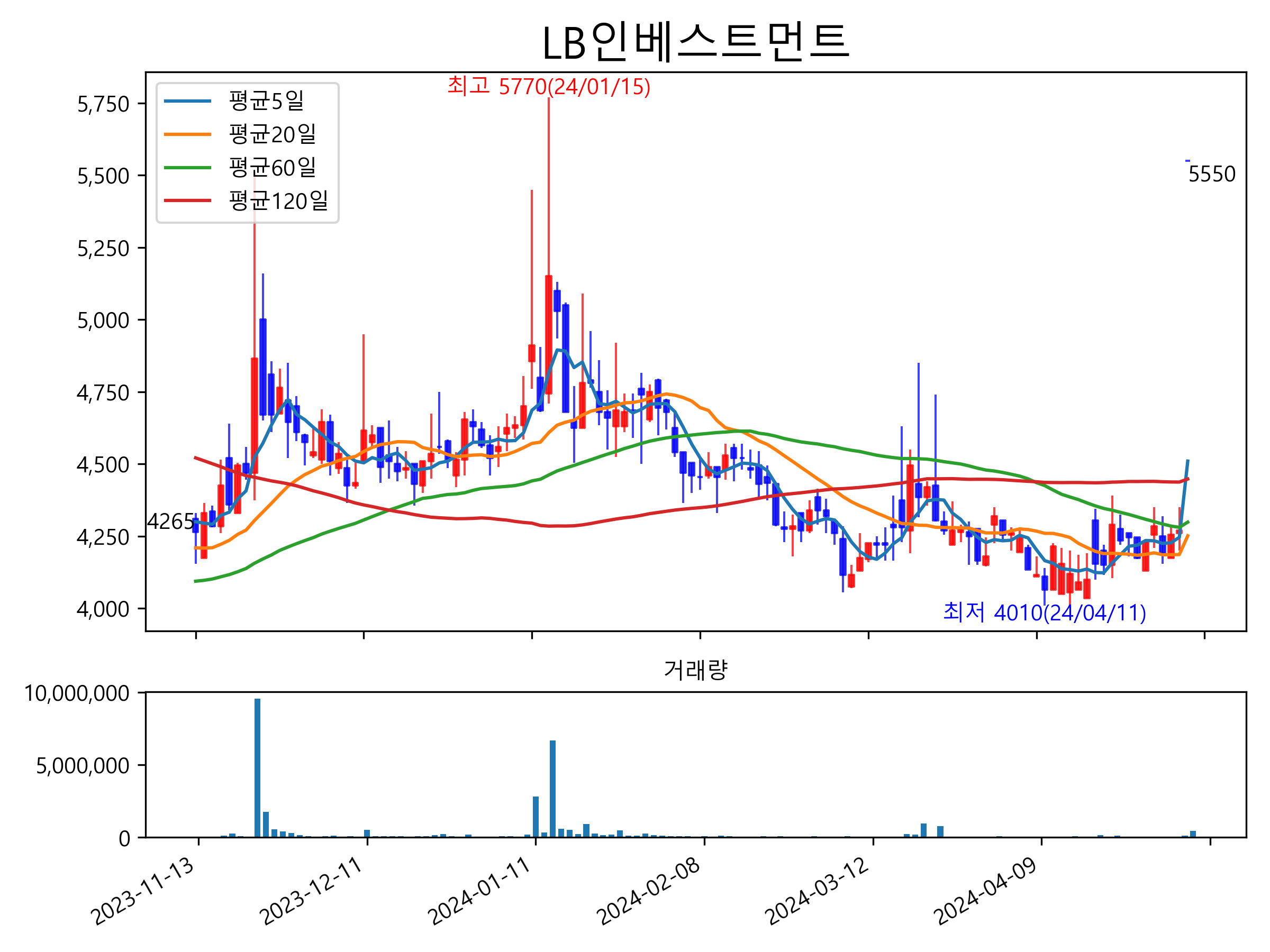 최근 6개월간 캔들차트 및 이동평균선입니다.