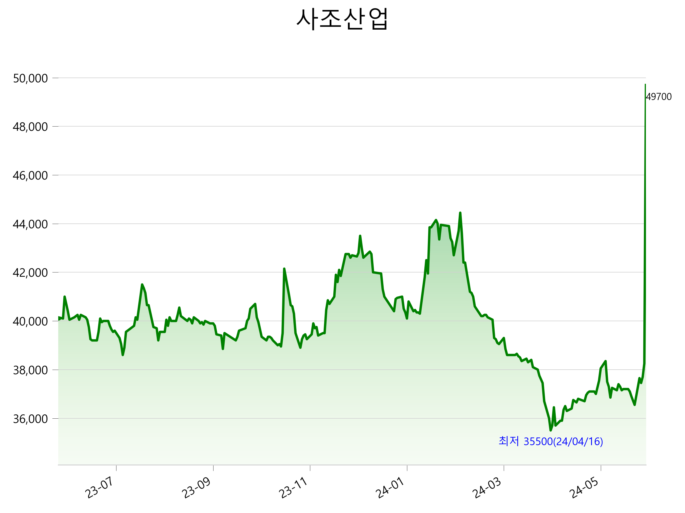 52주 최고가는 49,700원(2024-06-14), 52주 최저가는 35,500원(2024-04-16)으로 52주간 주가 상승률은 23.8% 입니다.