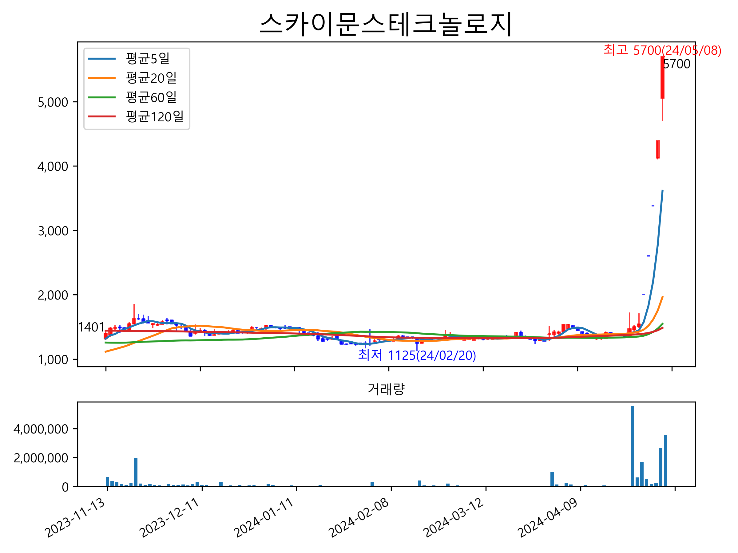 스카이문스테크놀로지는 5거래일 연속 상한가를 터치했습니다.