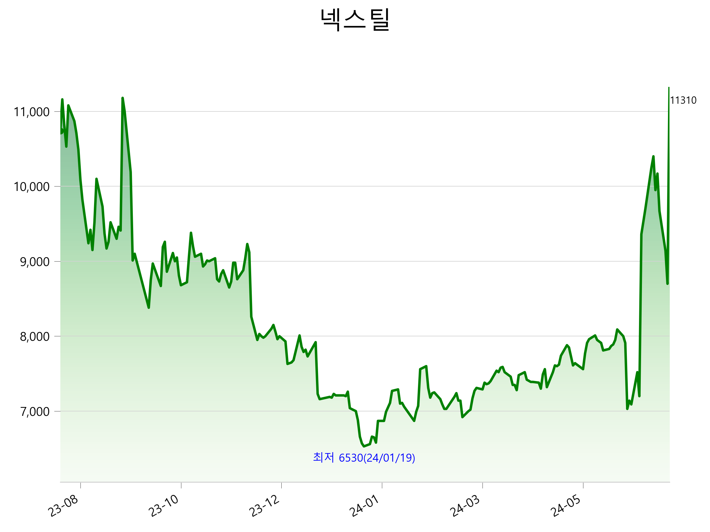 52주 최고가는 11,310원(2024-06-19), 52주 최저가는 6,530원(2024-01-19)으로 52주간 주가 상승률은 5.3% 입니다.