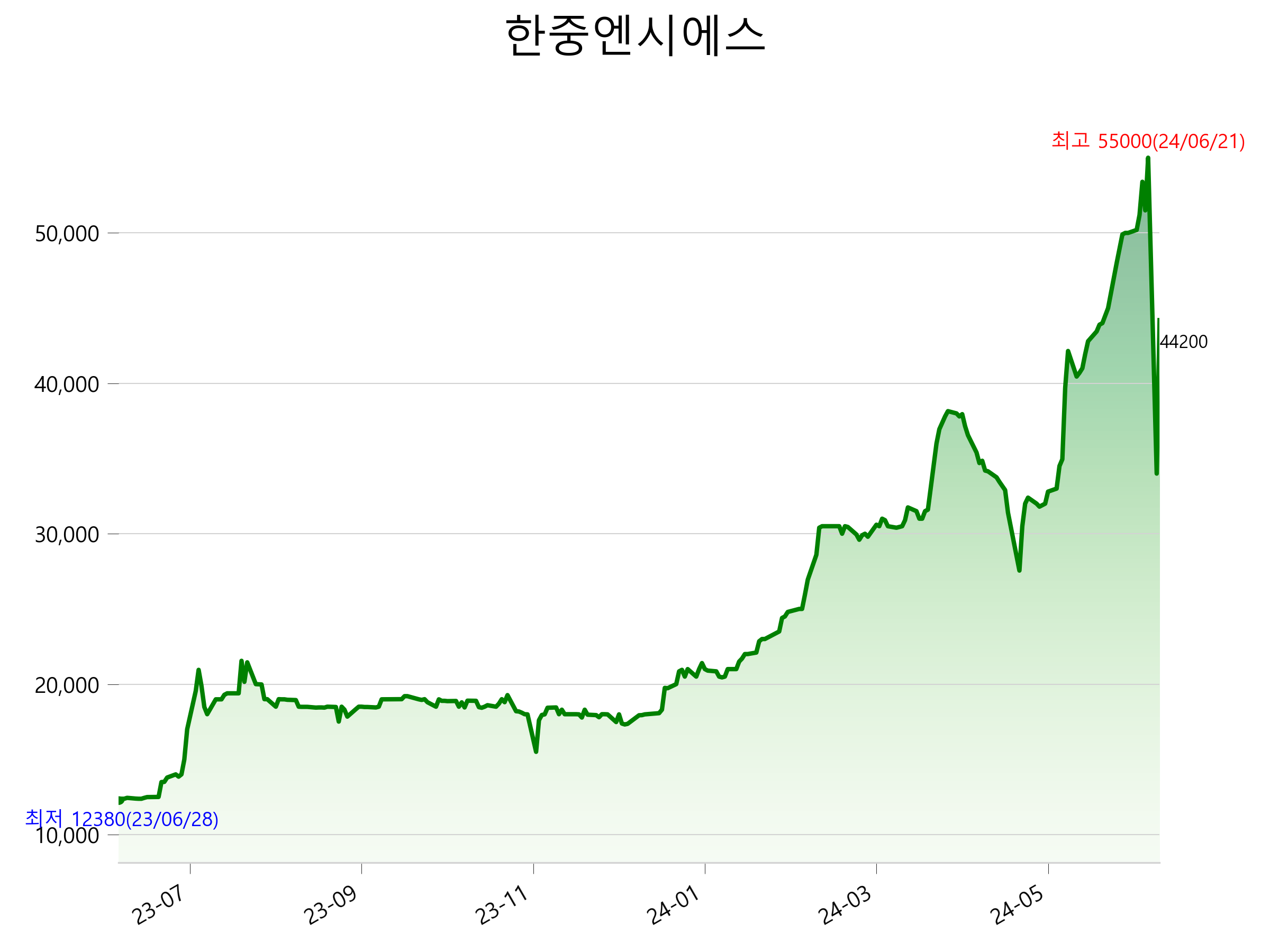 52주 최고가는 55,000원(2024-06-21), 52주 최저가는 12,380원(2023-06-28)으로 52주간 주가 상승률은 256.5% 입니다.
