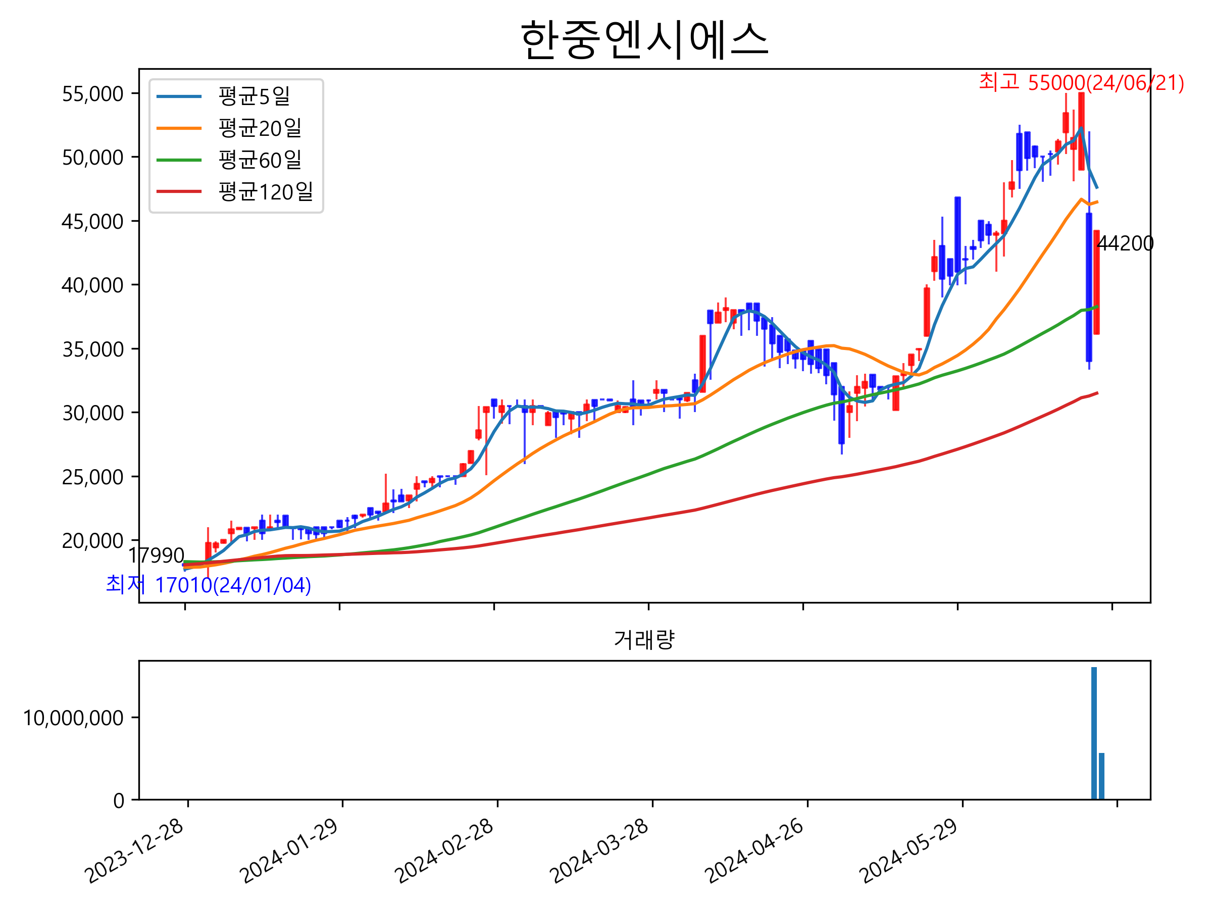 최근 6개월간 캔들차트 및 이동평균선입니다.