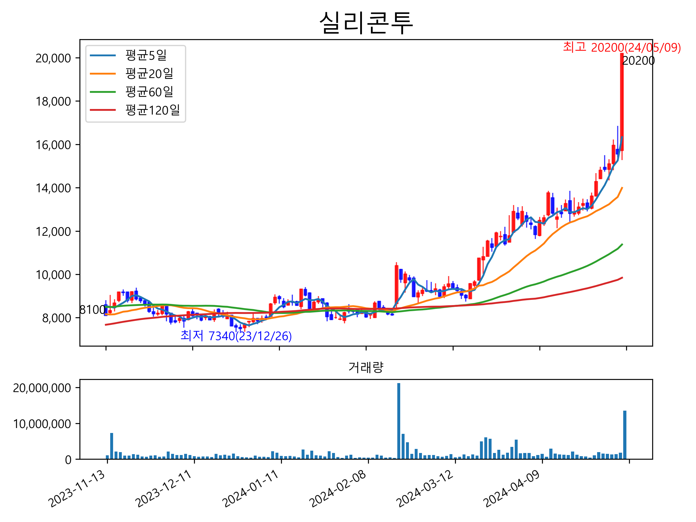 최근 6개월간 캔들차트 및 이동평균선입니다.