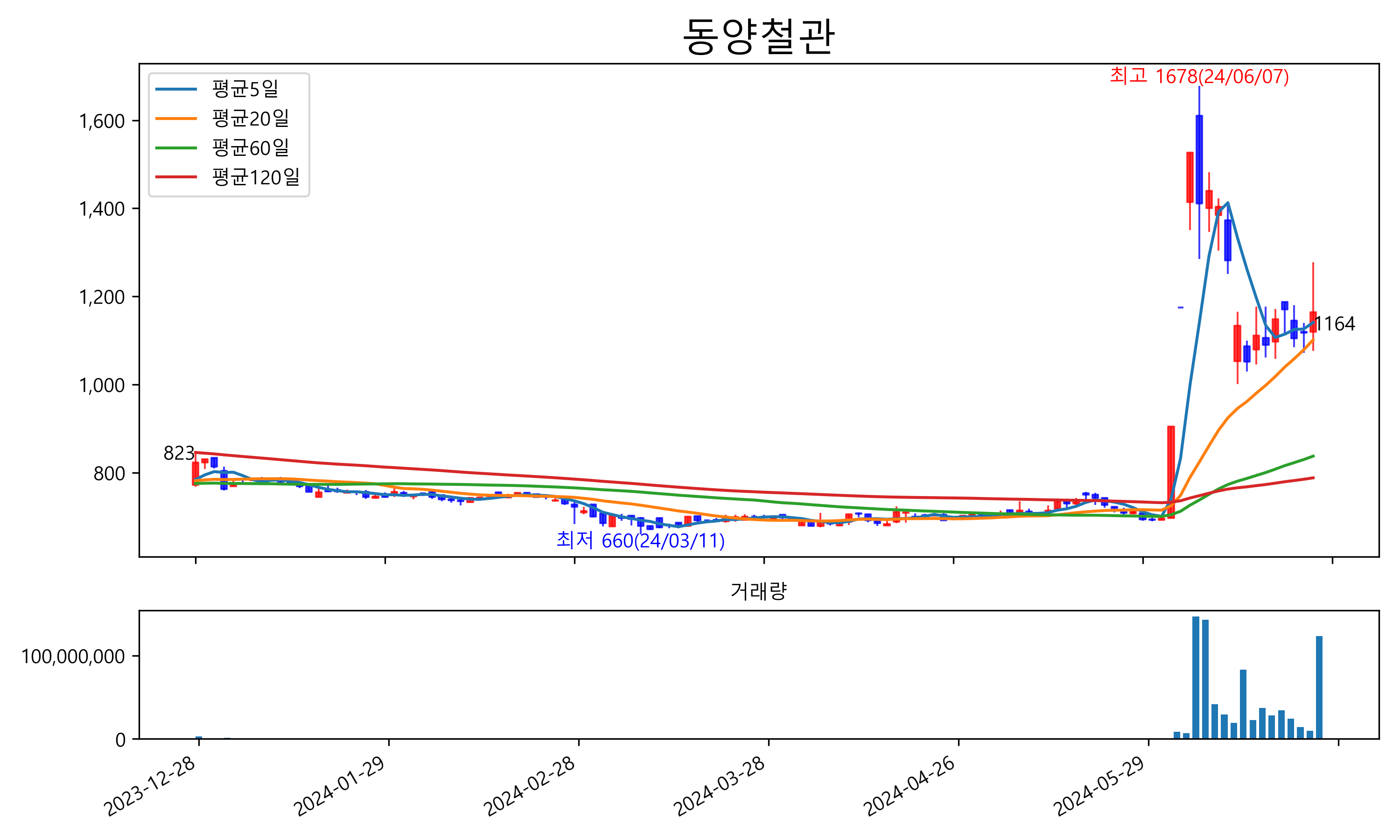 최근 6개월간 캔들차트 및 이동평균선입니다.