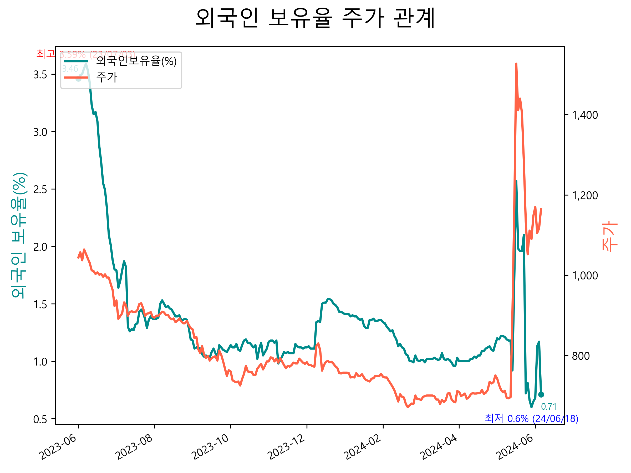 최근 1년간 외국인 보유율 및 주가와의 관계입니다.