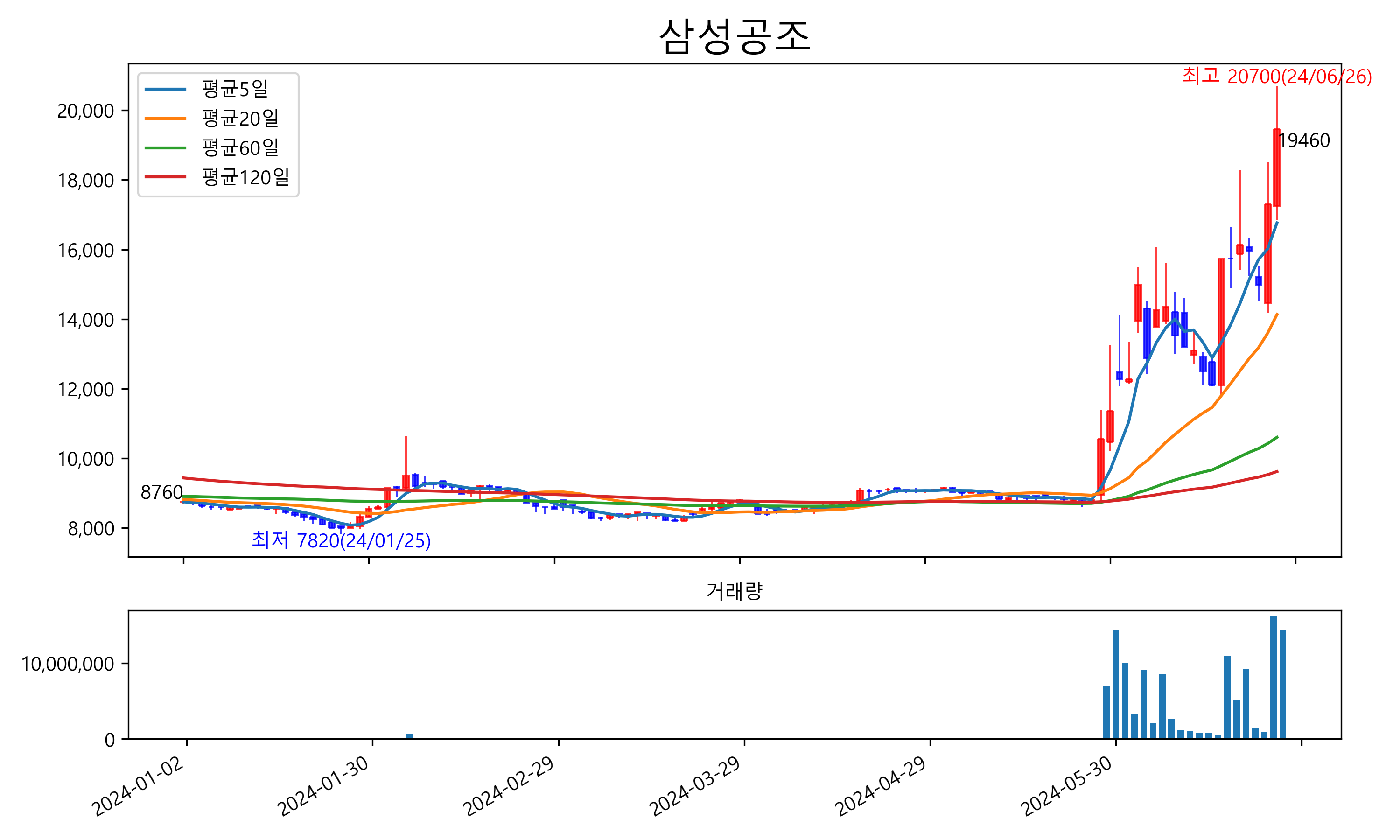 최근 6개월간 캔들차트 및 이동평균선입니다.