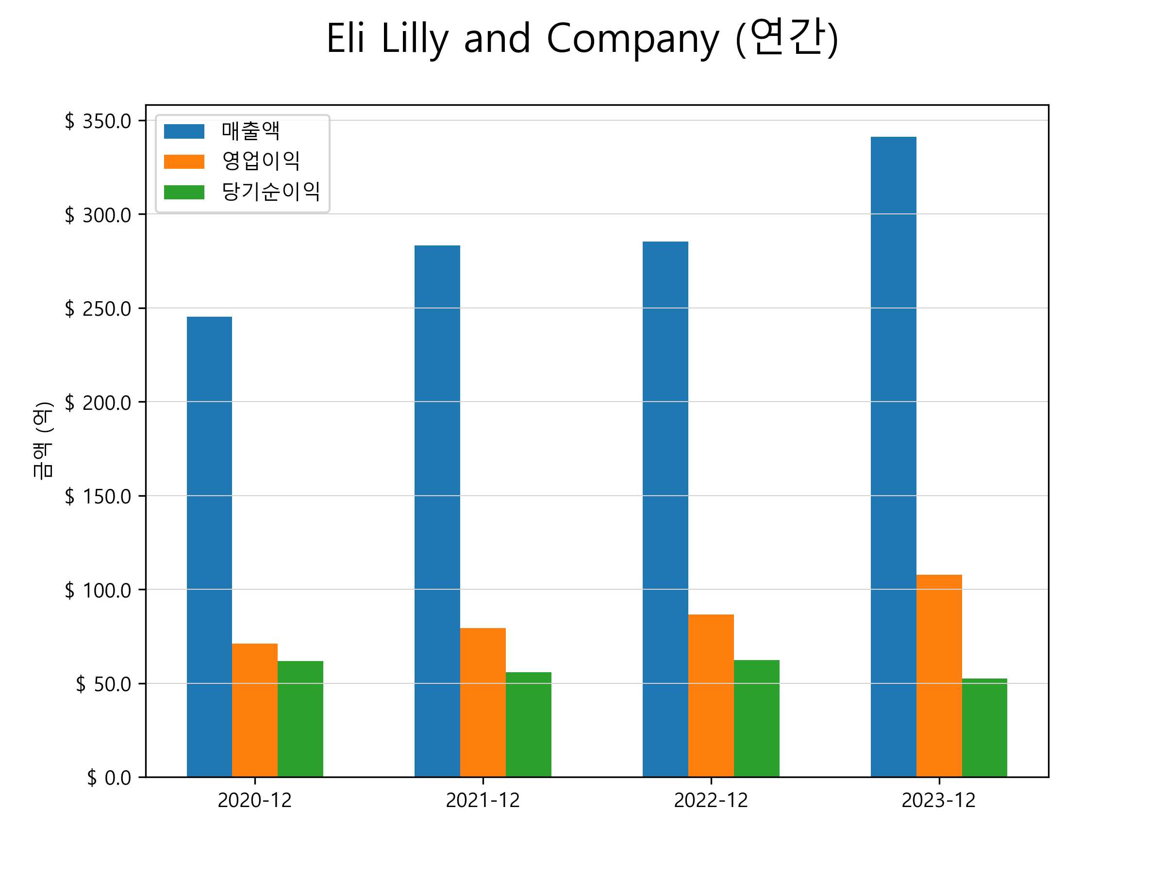 일라이 릴리 앤 컴퍼니의 2023년 매출은 341.2억달러(약 47조 1538억원), 영업이익 107.9억달러(약 14조 9118억원), 당기순이익 52.4억달러(약 7조 2417억원)을 기록했습니다. 연간별 매출 및 영업이익, 당기순이익 표입니다.