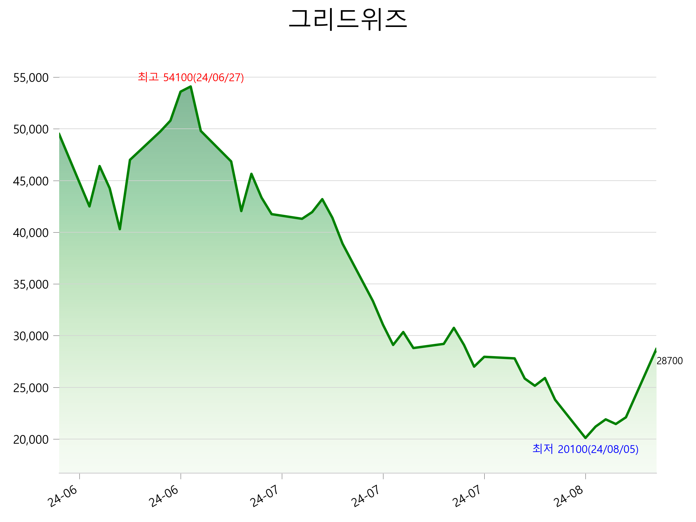 52주 최고가는 54,100원(2024-06-27), 52주 최저가는 20,100원(2024-08-05)으로 52주간 주가 상승률은 -42.0% 입니다.