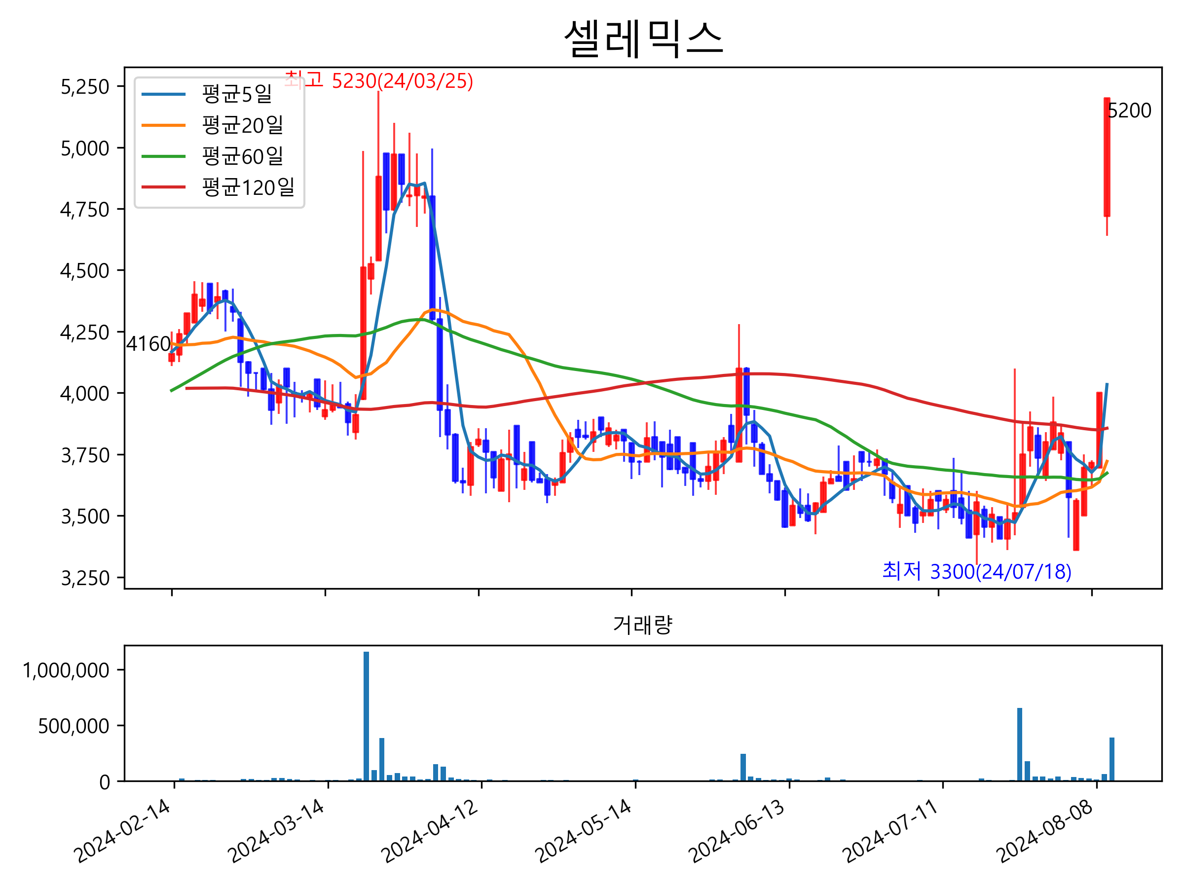 최근 6개월간 캔들차트 및 이동평균선입니다.