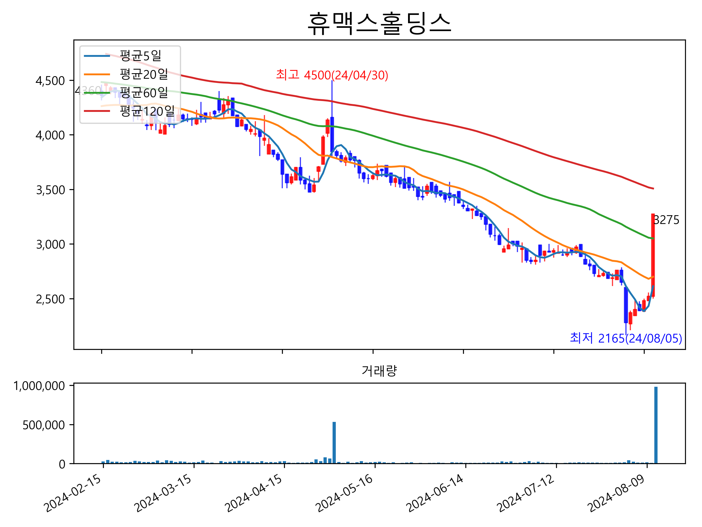 최근 6개월간 캔들차트 및 이동평균선입니다.