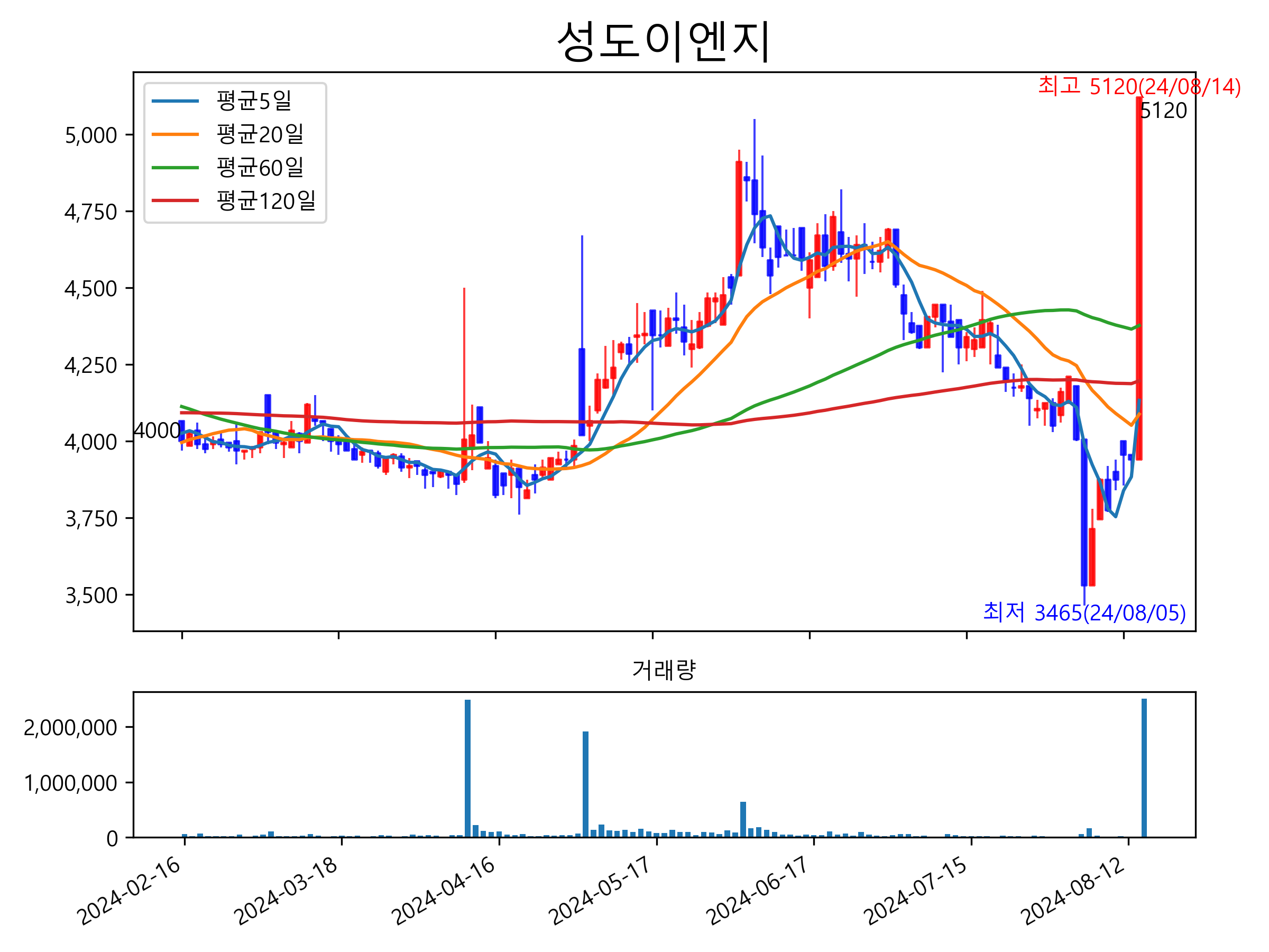 최근 6개월간 캔들차트 및 이동평균선입니다.