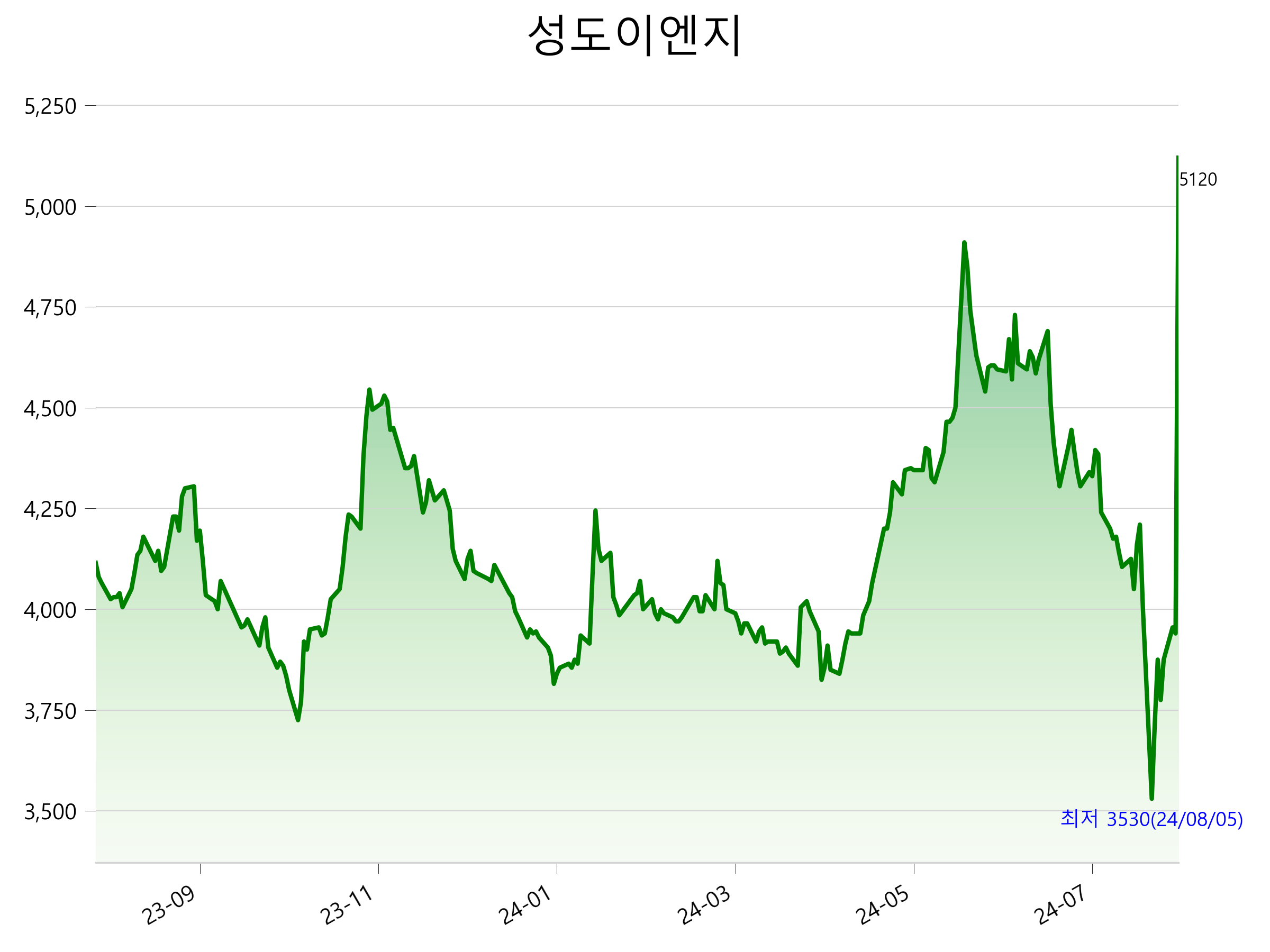 8월 14일 기준 주가는 5,120원 입니다. 아래는 최근 1년간의 주가흐름입니다.