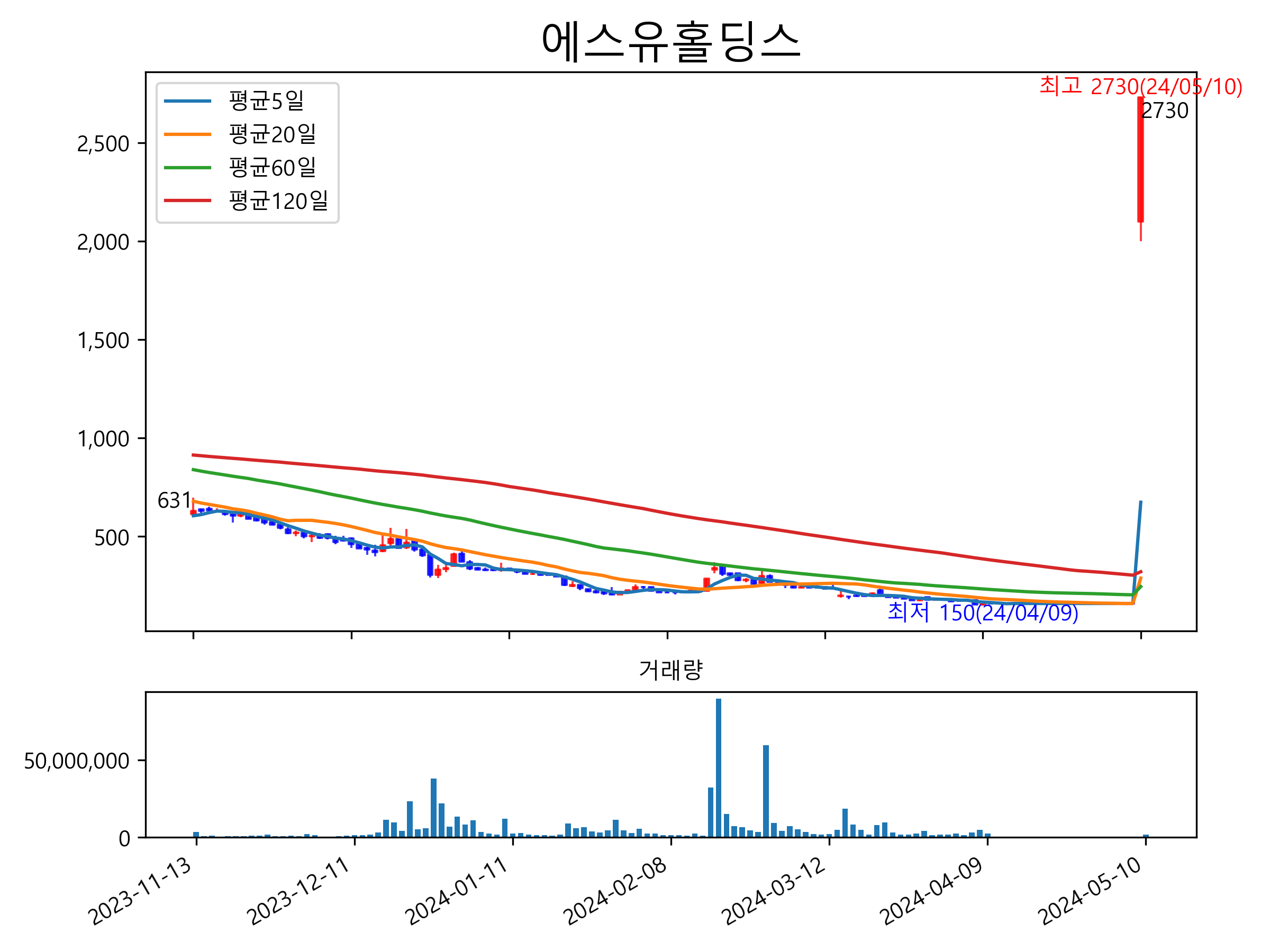 최근 6개월간 캔들차트 및 이동평균선입니다.