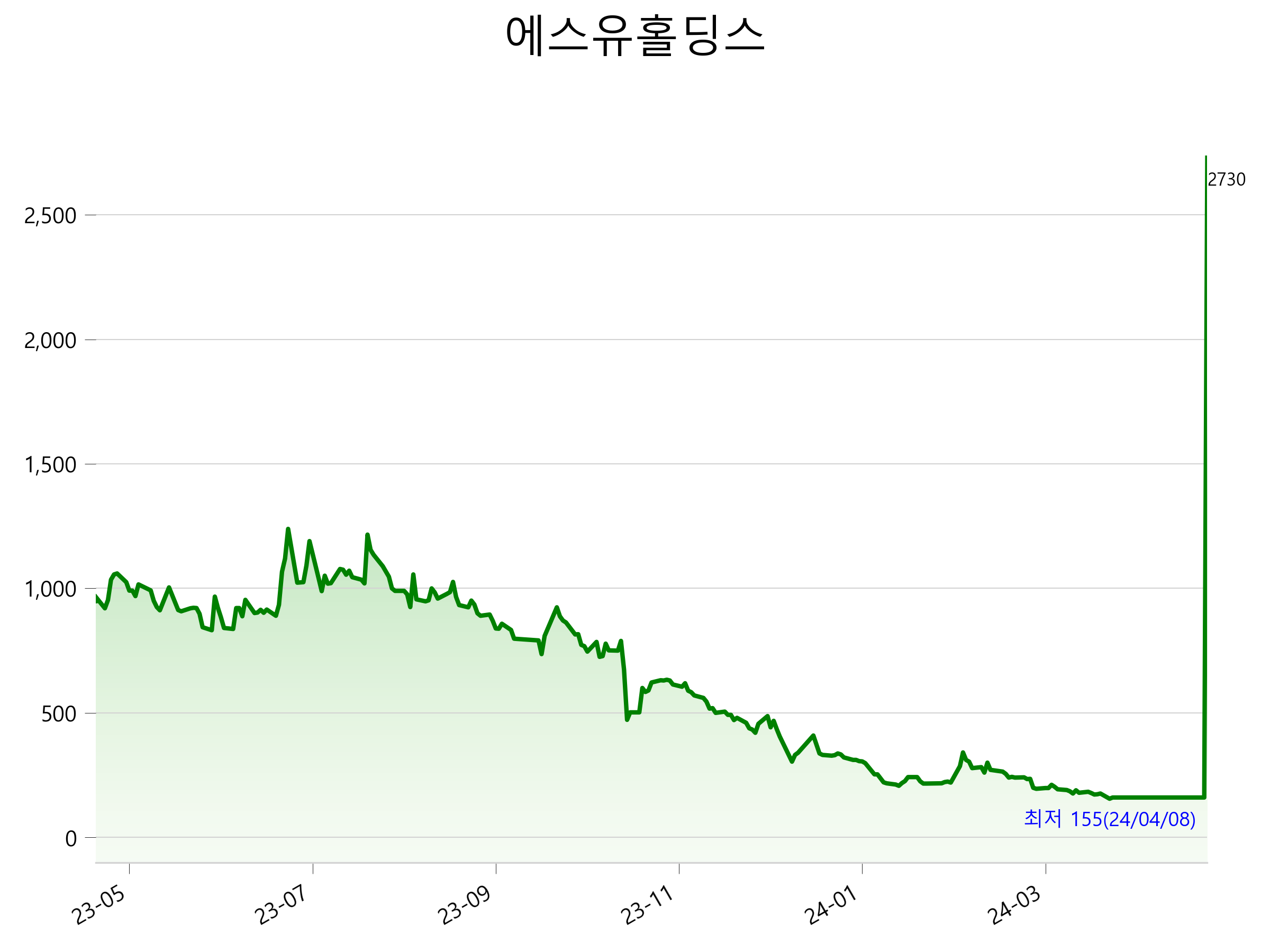 52주 최고가는 2,730원(2024-05-10), 52주 최저가는 155원(2024-04-08)으로 52주간 주가 상승률은 182.6% 입니다.