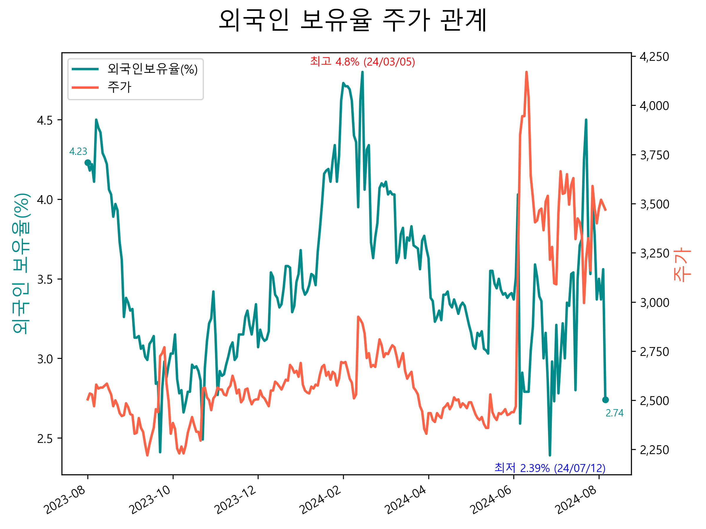 최근 1년간 외국인 보유율 및 주가와의 관계입니다.