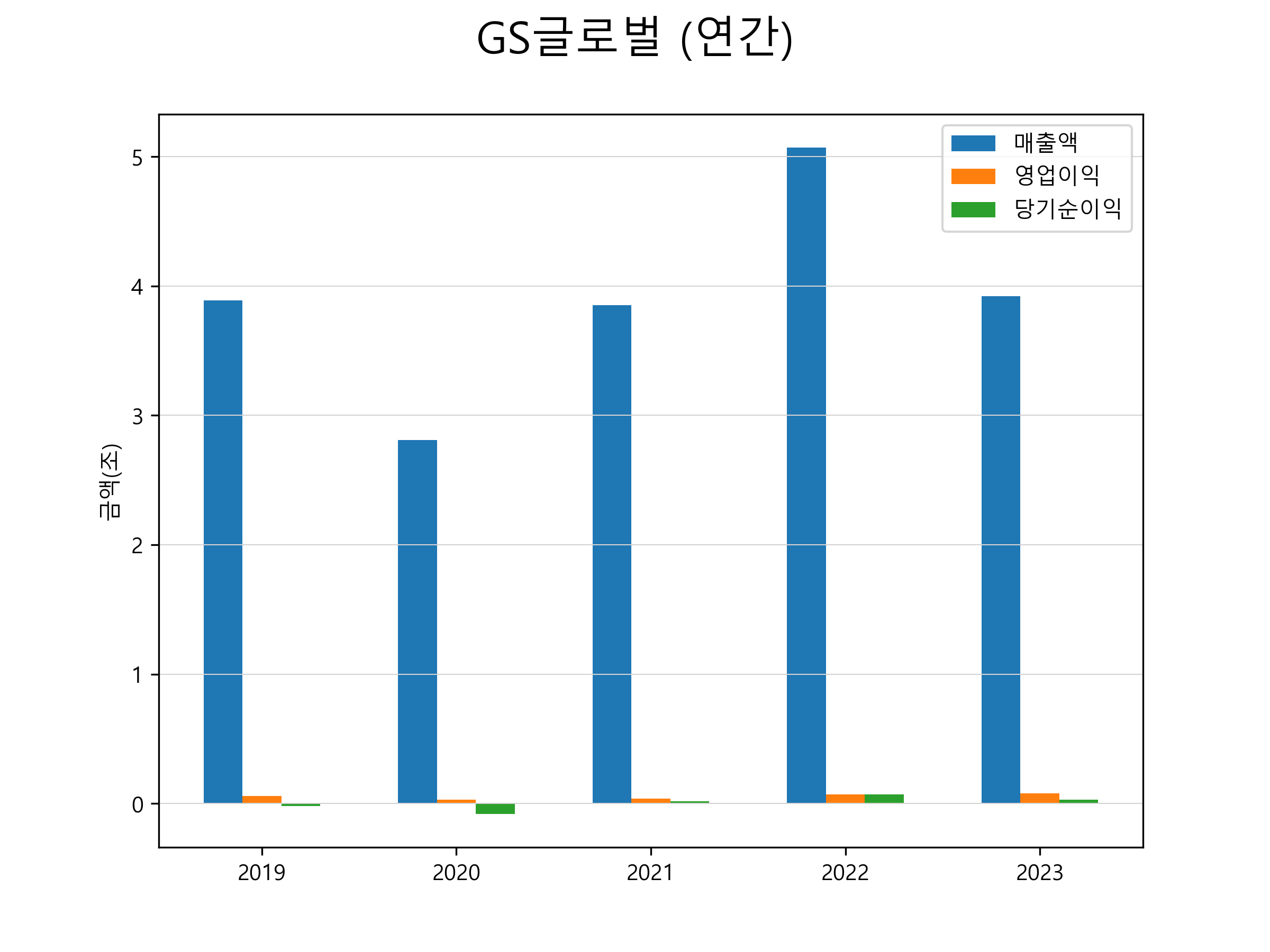 GS글로벌의 최근 5년간 실적입니다. 2023년 매출은 3조 9165억원, 영업이익 765억원, 당기순이익 261억원을 기록했습니다. 연간 매출 및 영업이익, 당기순이익 표입니다.