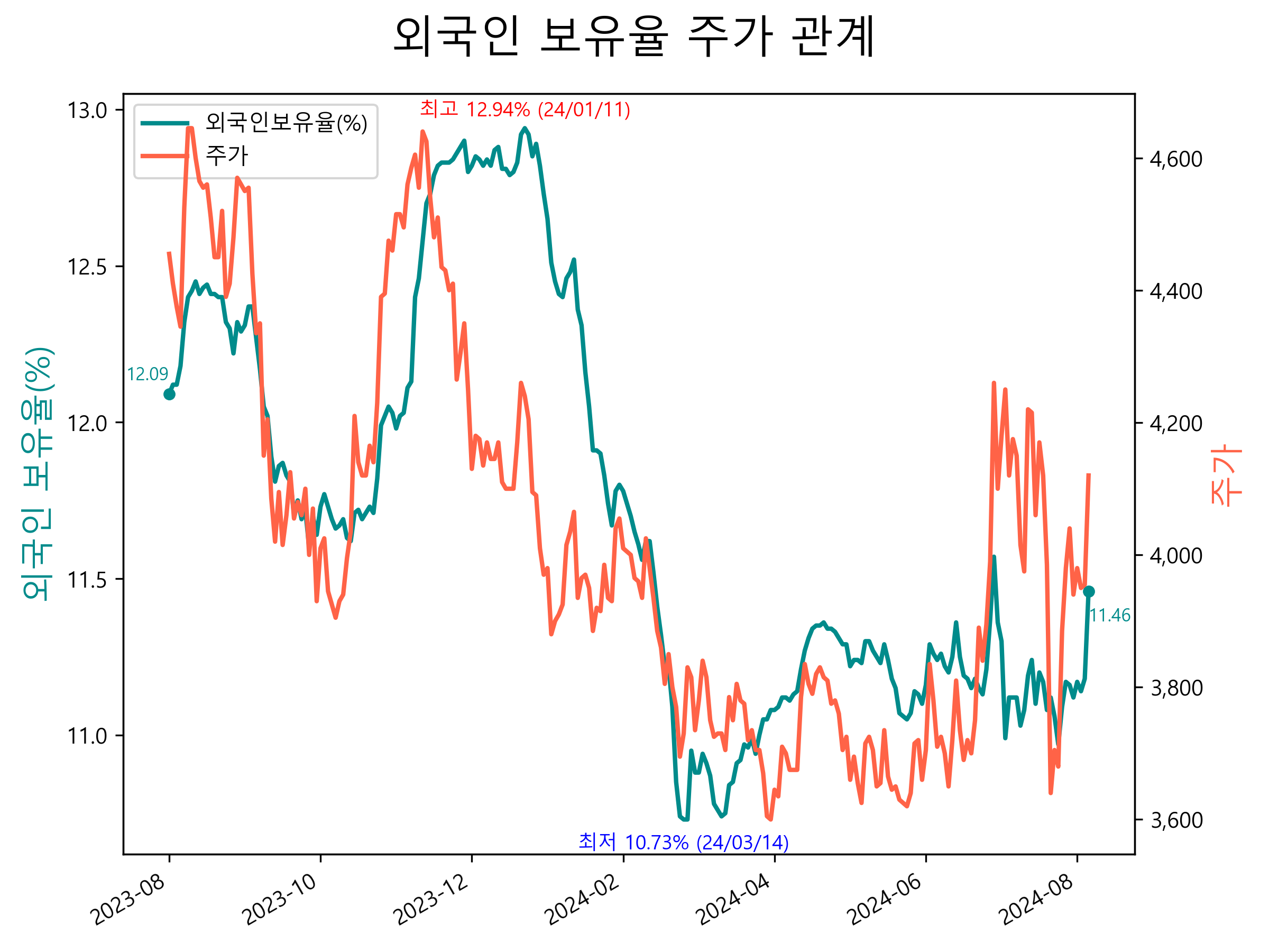 최근 1년간 외국인 보유율 및 주가와의 관계입니다.