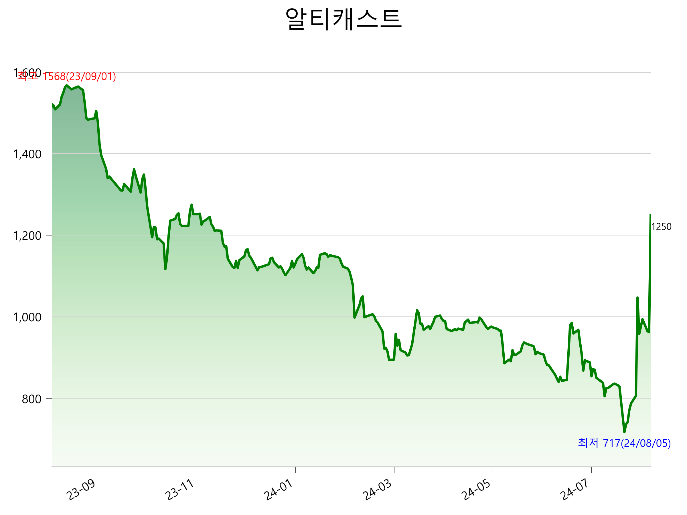 52주 최고가는 1,568원(2023-09-01), 52주 최저가는 717원(2024-08-05)으로 52주간 주가 상승률은 -17.9% 입니다.