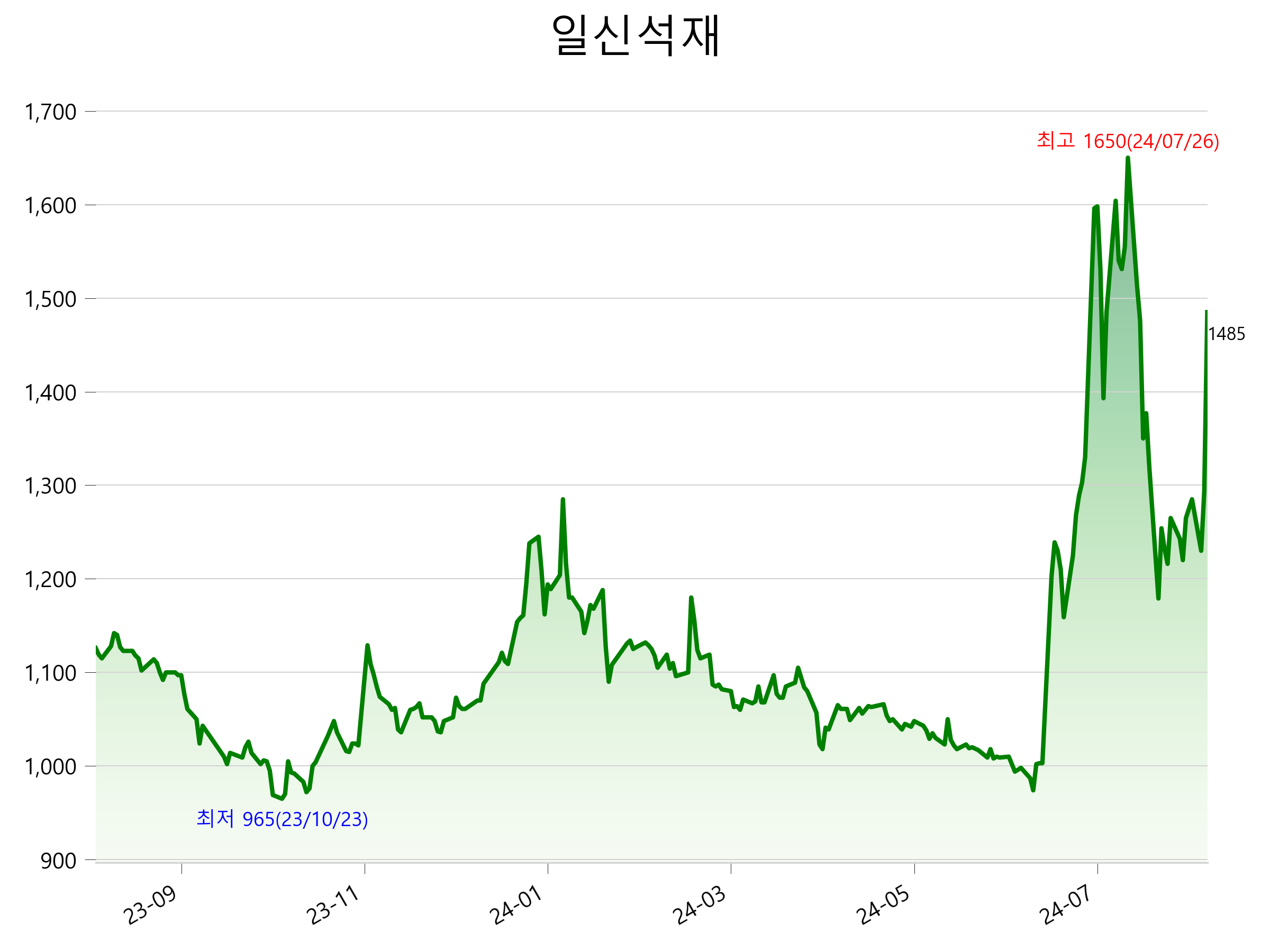 8월 21일 기준 주가는 1,485원 입니다. 아래는 최근 1년간의 주가흐름입니다.