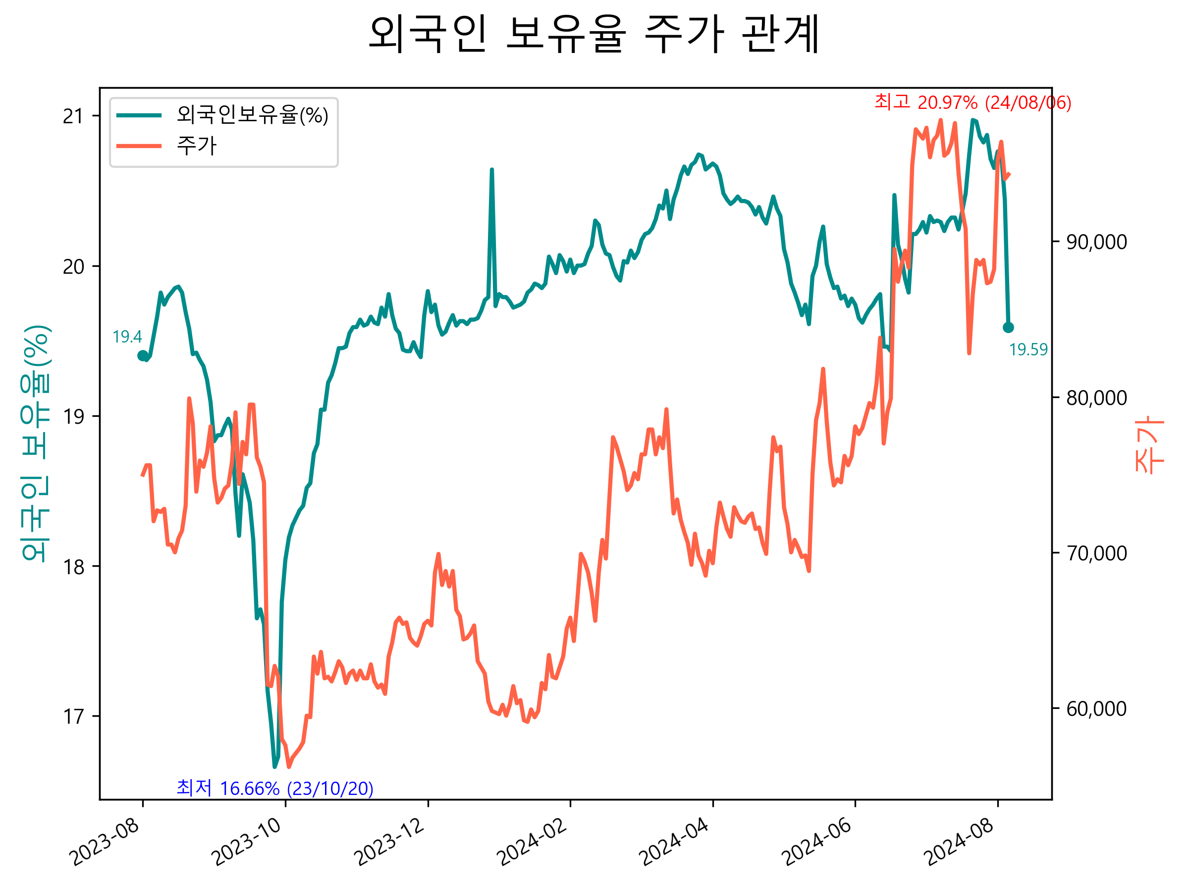최근 1년간 외국인 보유율 및 주가와의 관계입니다.