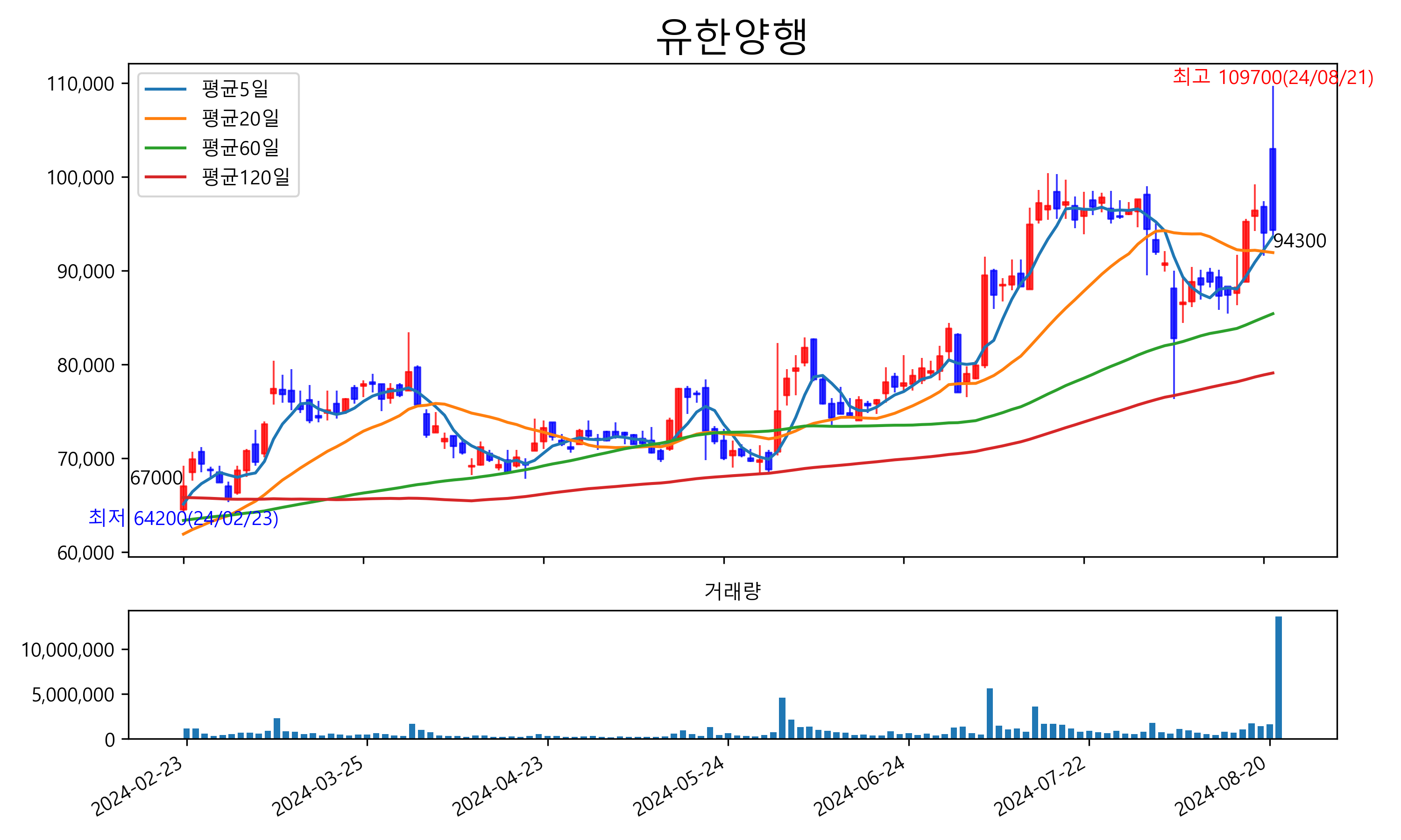 최근 6개월간 캔들차트 및 이동평균선입니다.