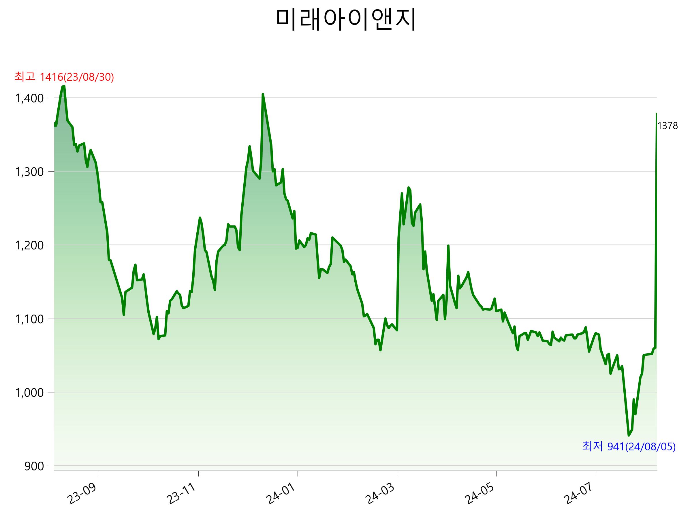 8월 22일 기준 주가는 1,378원 입니다. 아래는 최근 1년간의 주가흐름입니다.