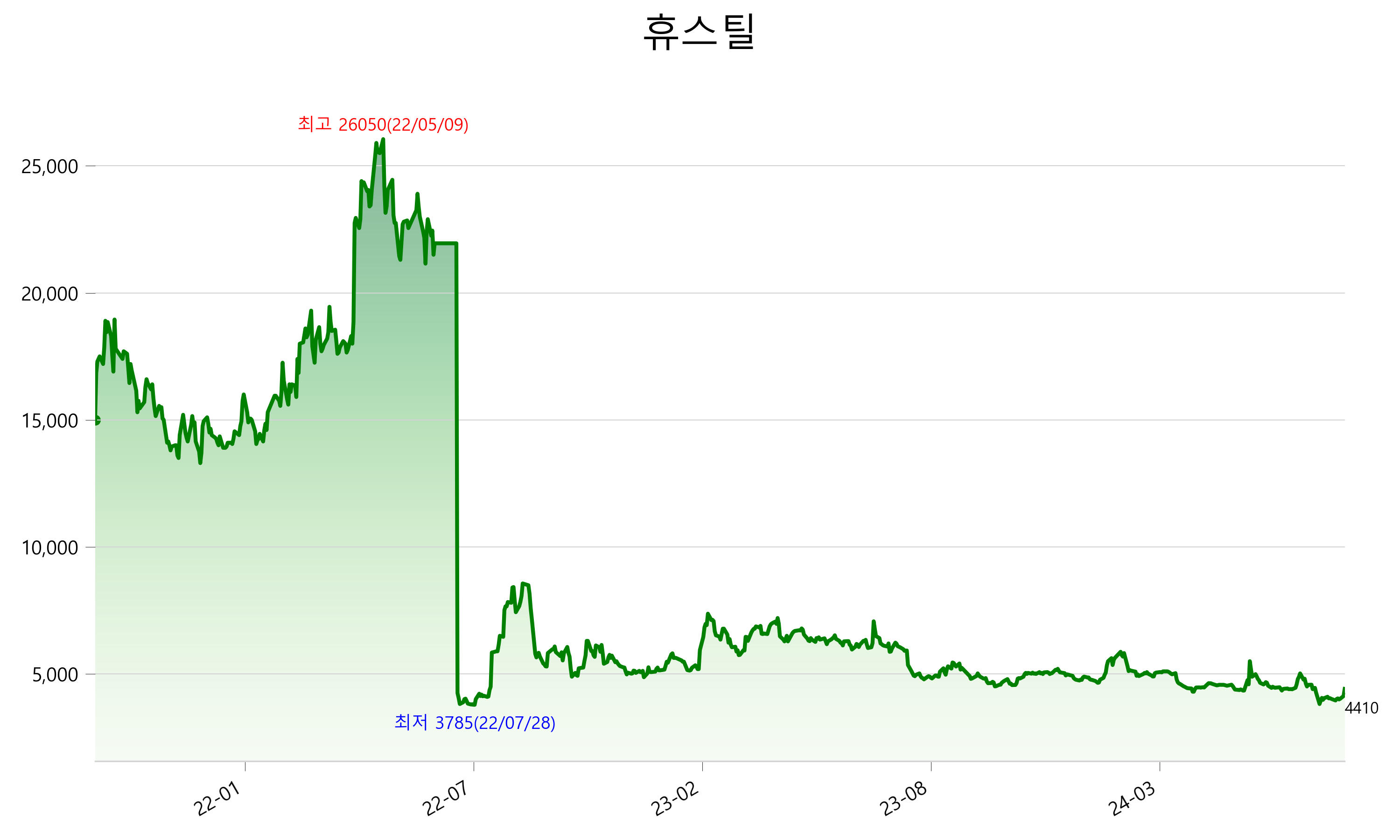 8월 27일 기준 주가는 4,410원 입니다. 아래는 최근 3년간의 주가흐름입니다.