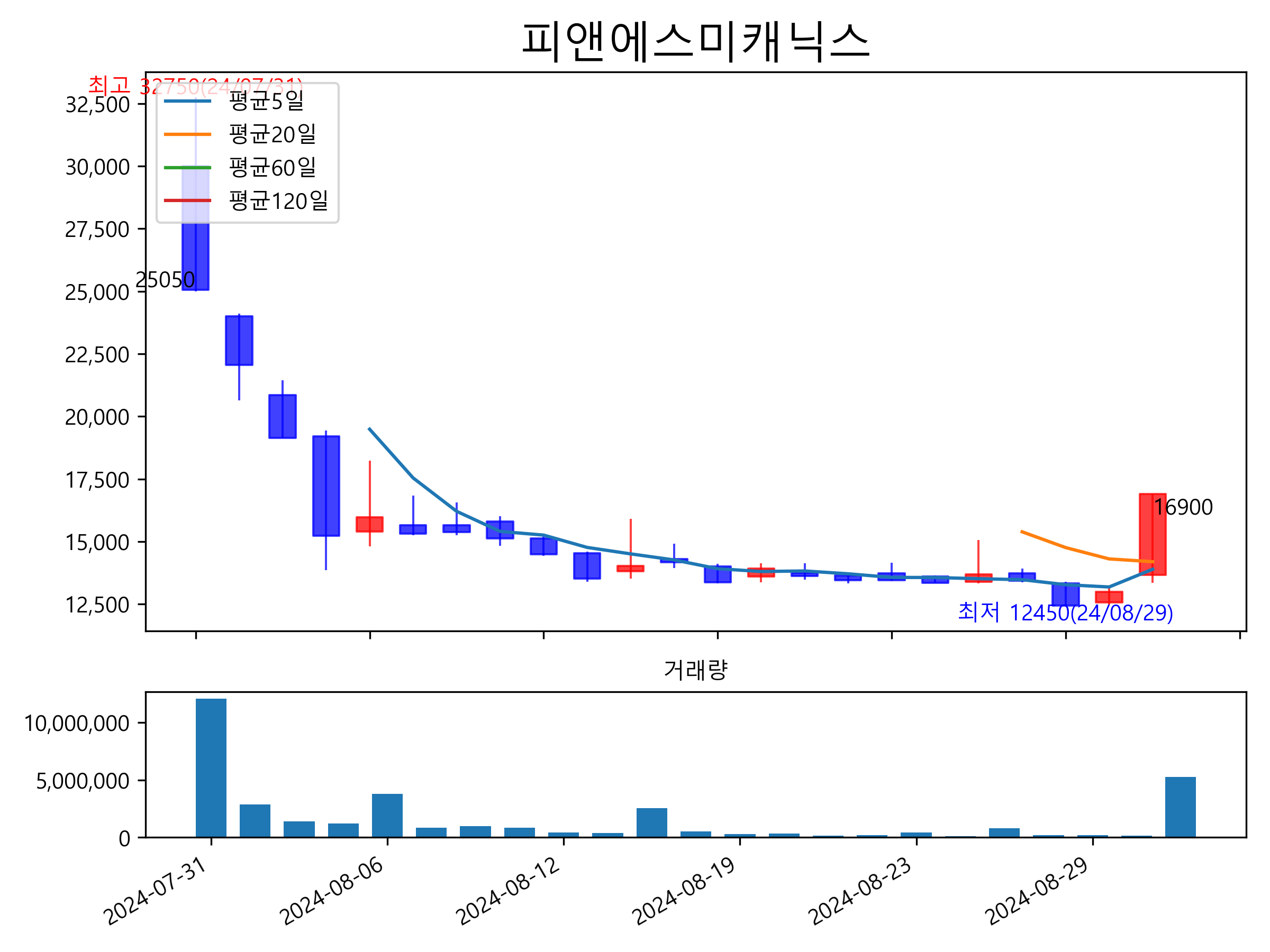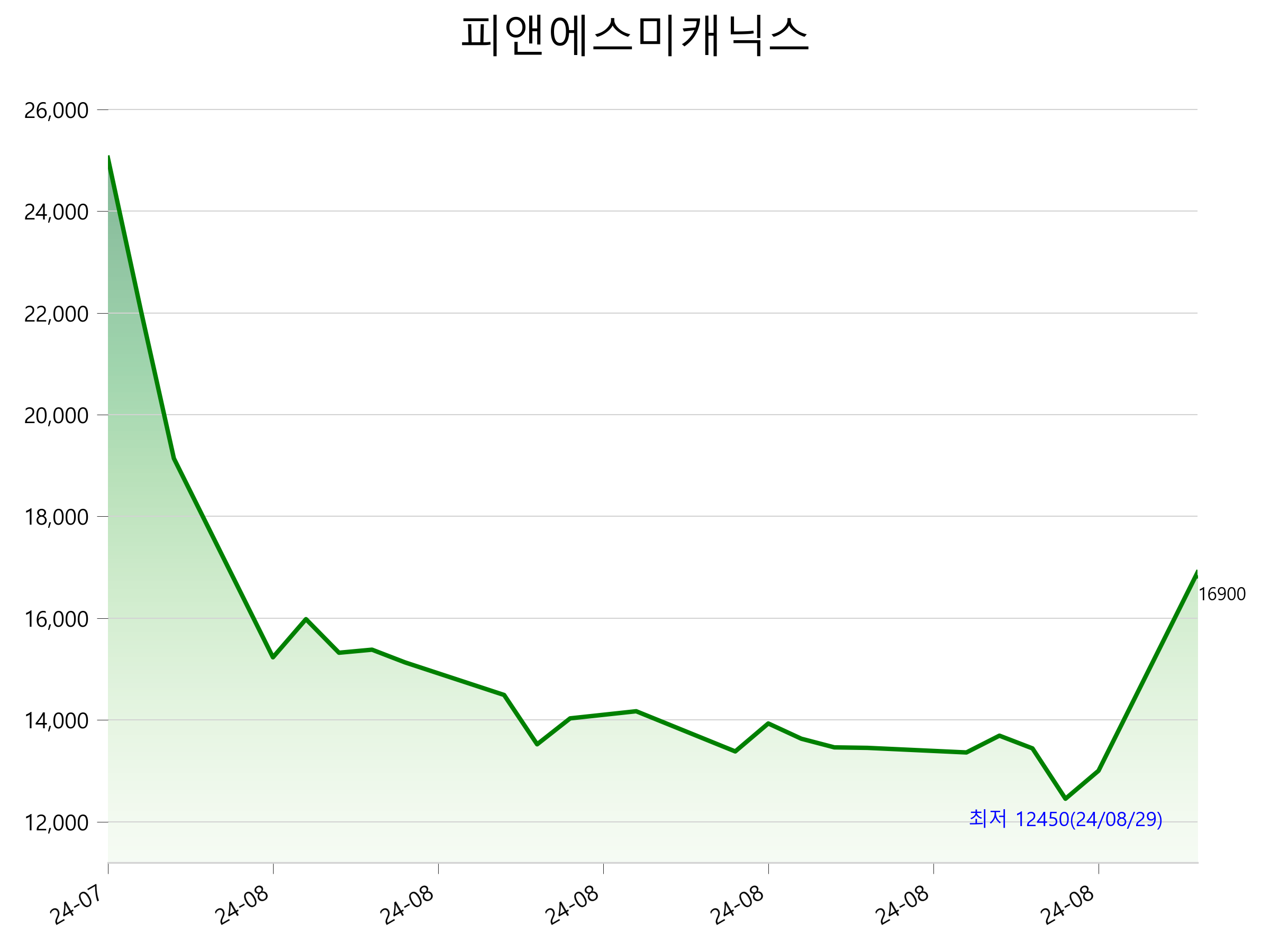52주 최고가는 25,050원(2024-07-31), 52주 최저가는 12,450원(2024-08-29)으로 52주간 주가 상승률은 -32.5% 입니다.