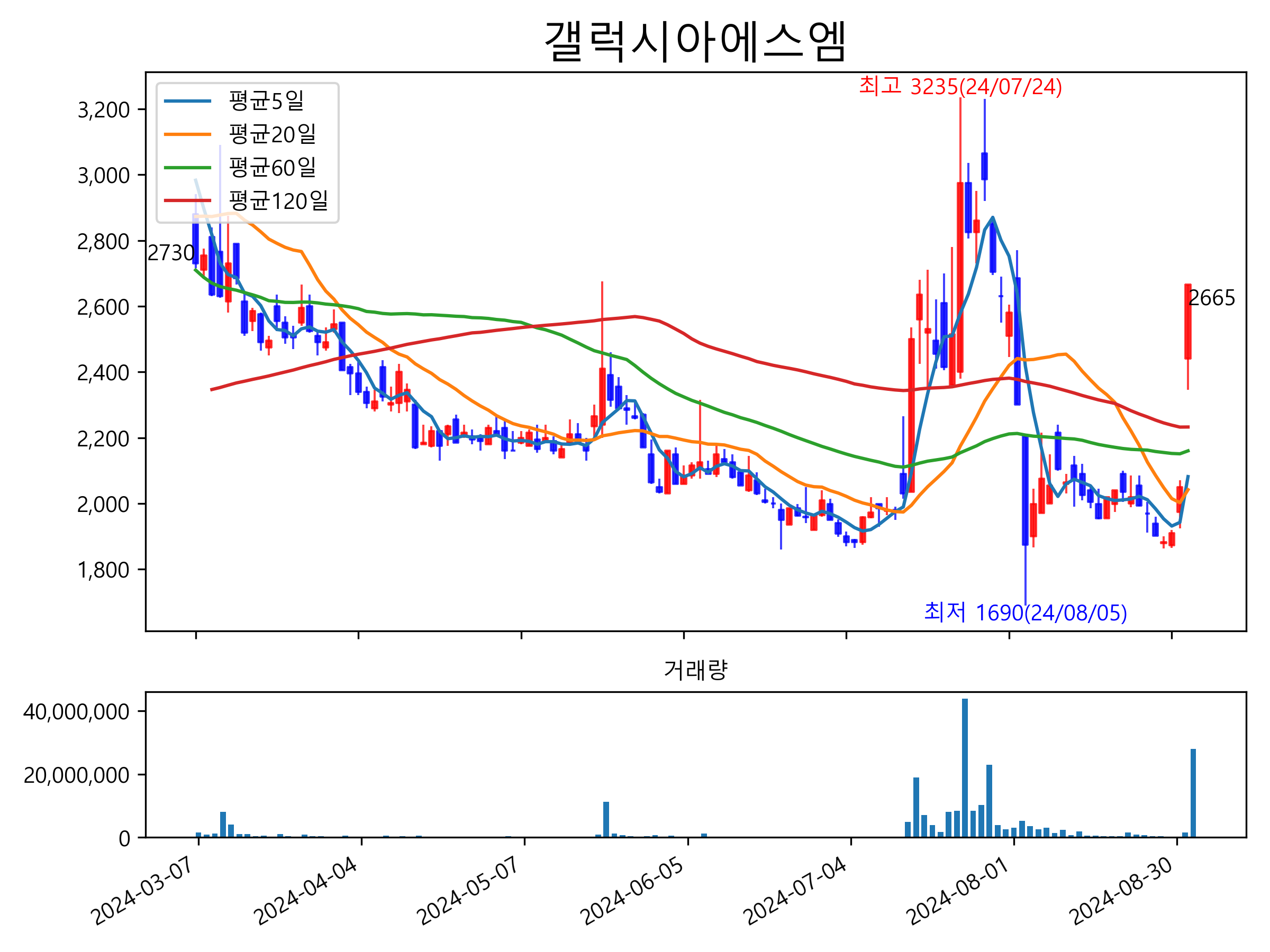최근 6개월간 캔들차트 및 이동평균선입니다.