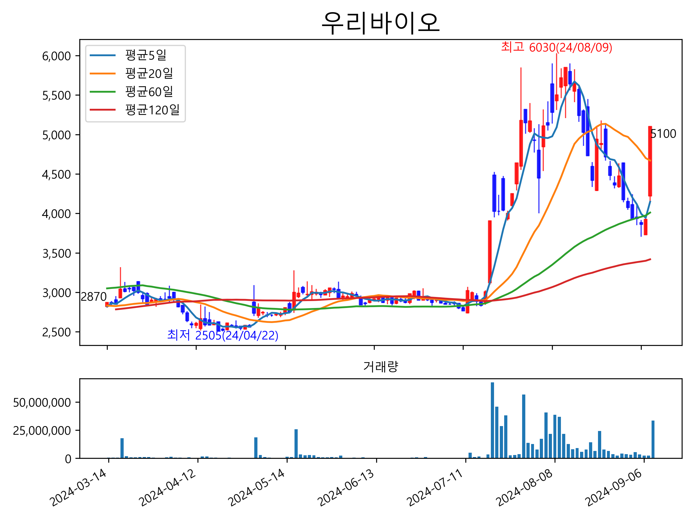 최근 6개월간 캔들차트 및 이동평균선입니다.