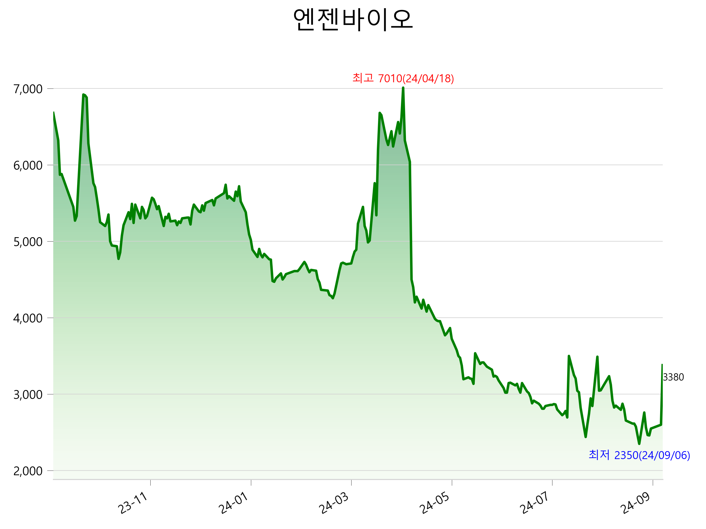 9월 20일 기준 주가는 3,380원 입니다. 아래는 최근 1년간의 주가흐름입니다.