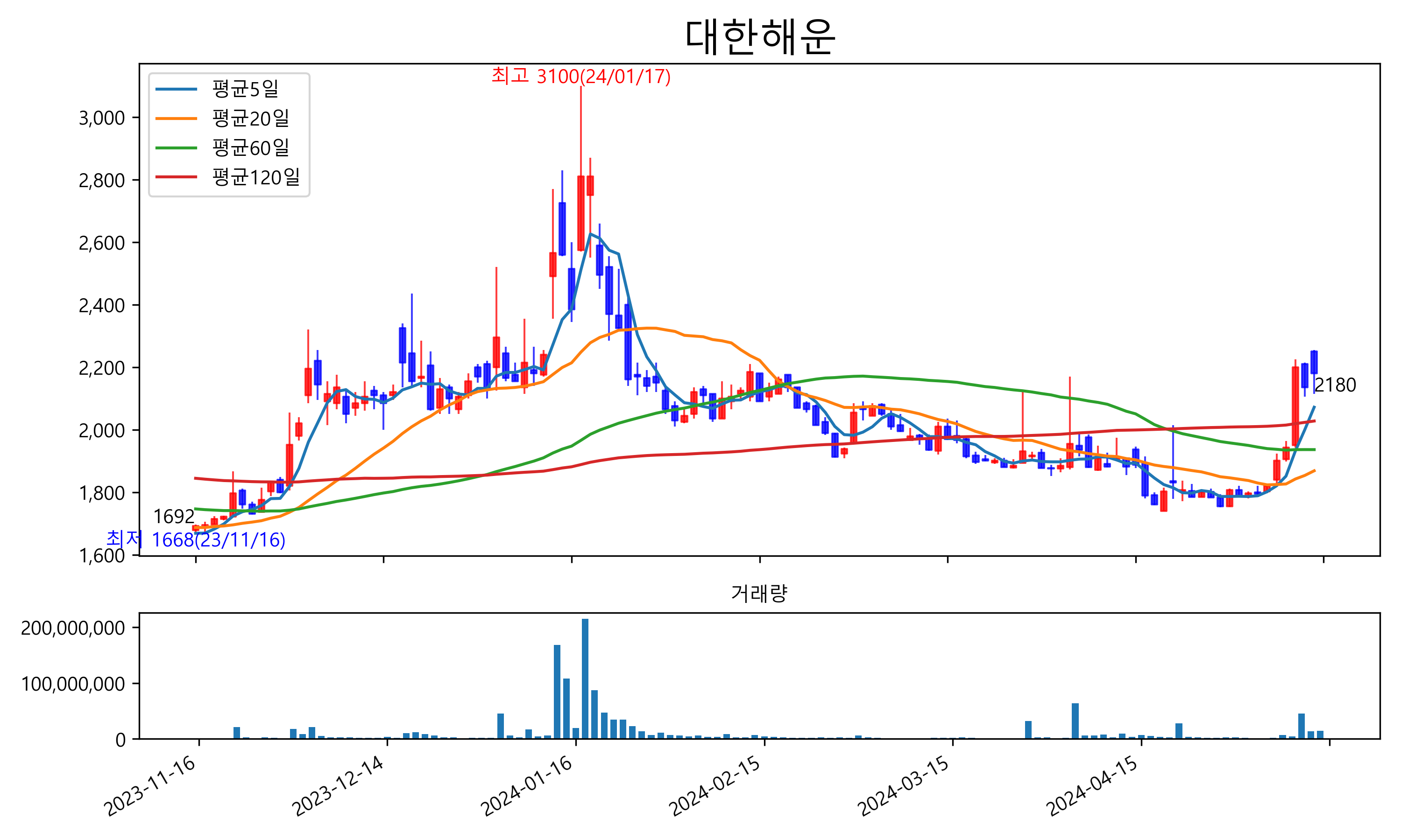 최근 6개월간 캔들차트 및 이동평균선입니다.