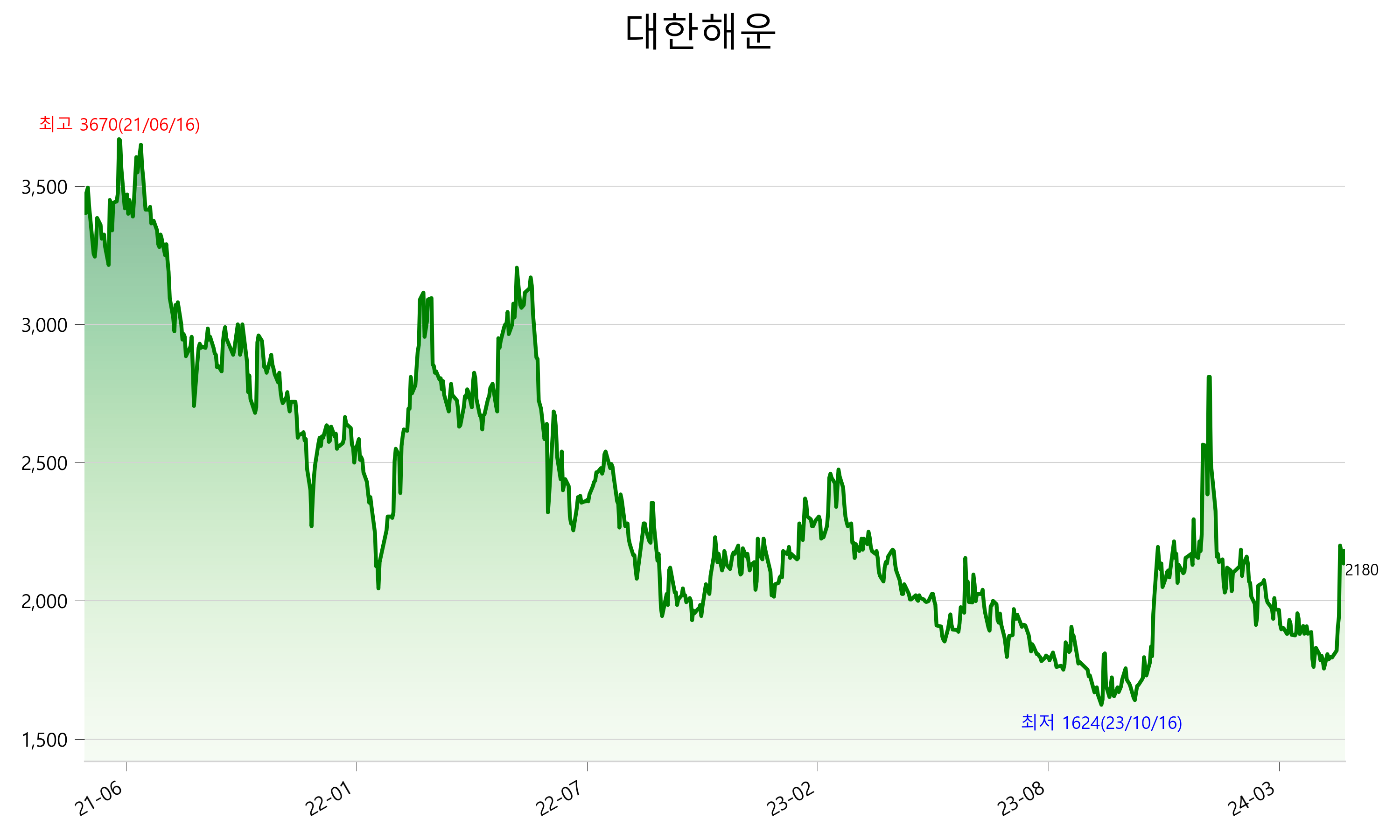 5월 14일 기준 주가는 2,180원 입니다. 아래는 최근 3년간의 주가흐름입니다.