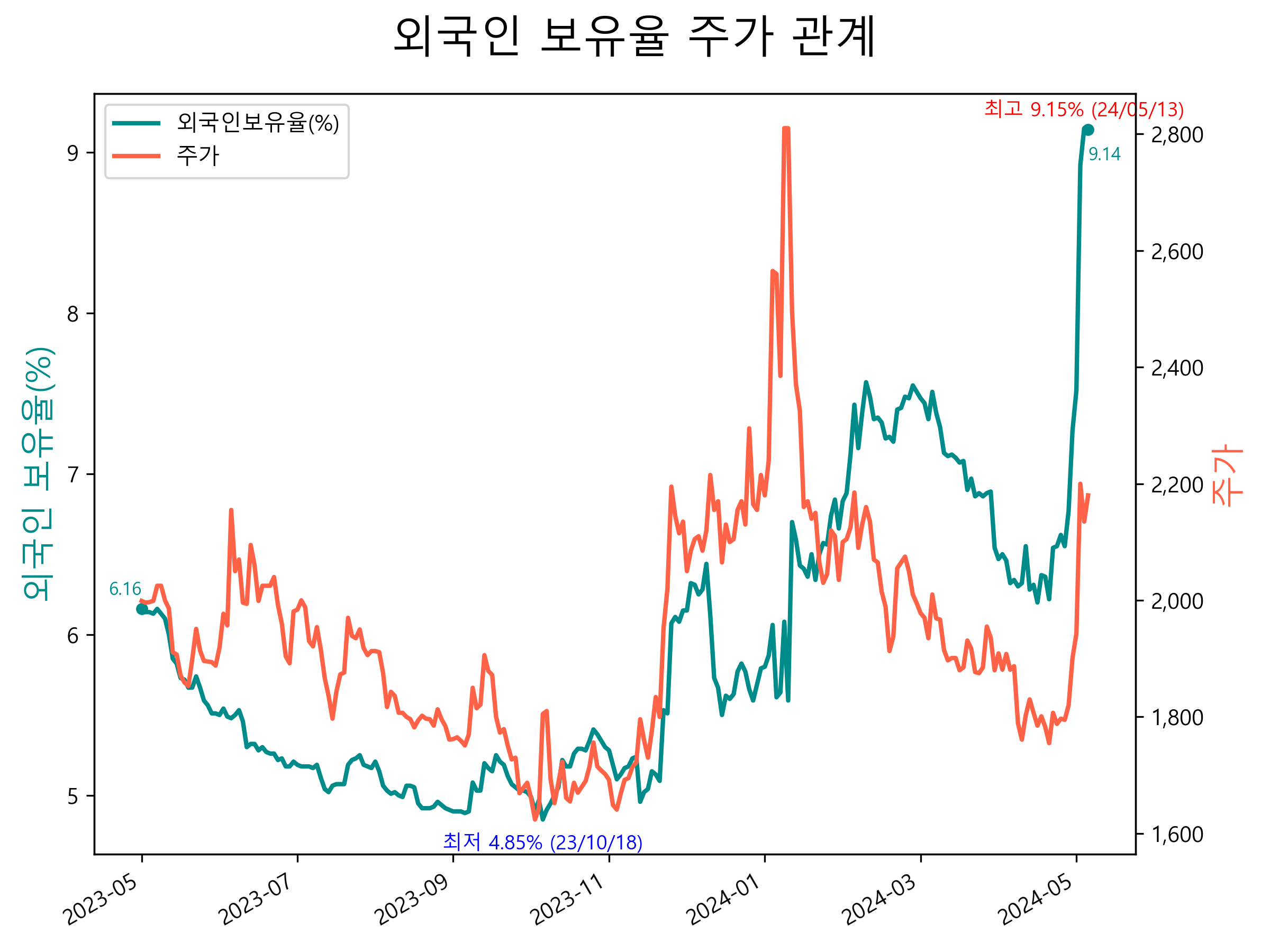 최근 1년간 외국인 보유율 및 주가와의 관계입니다.