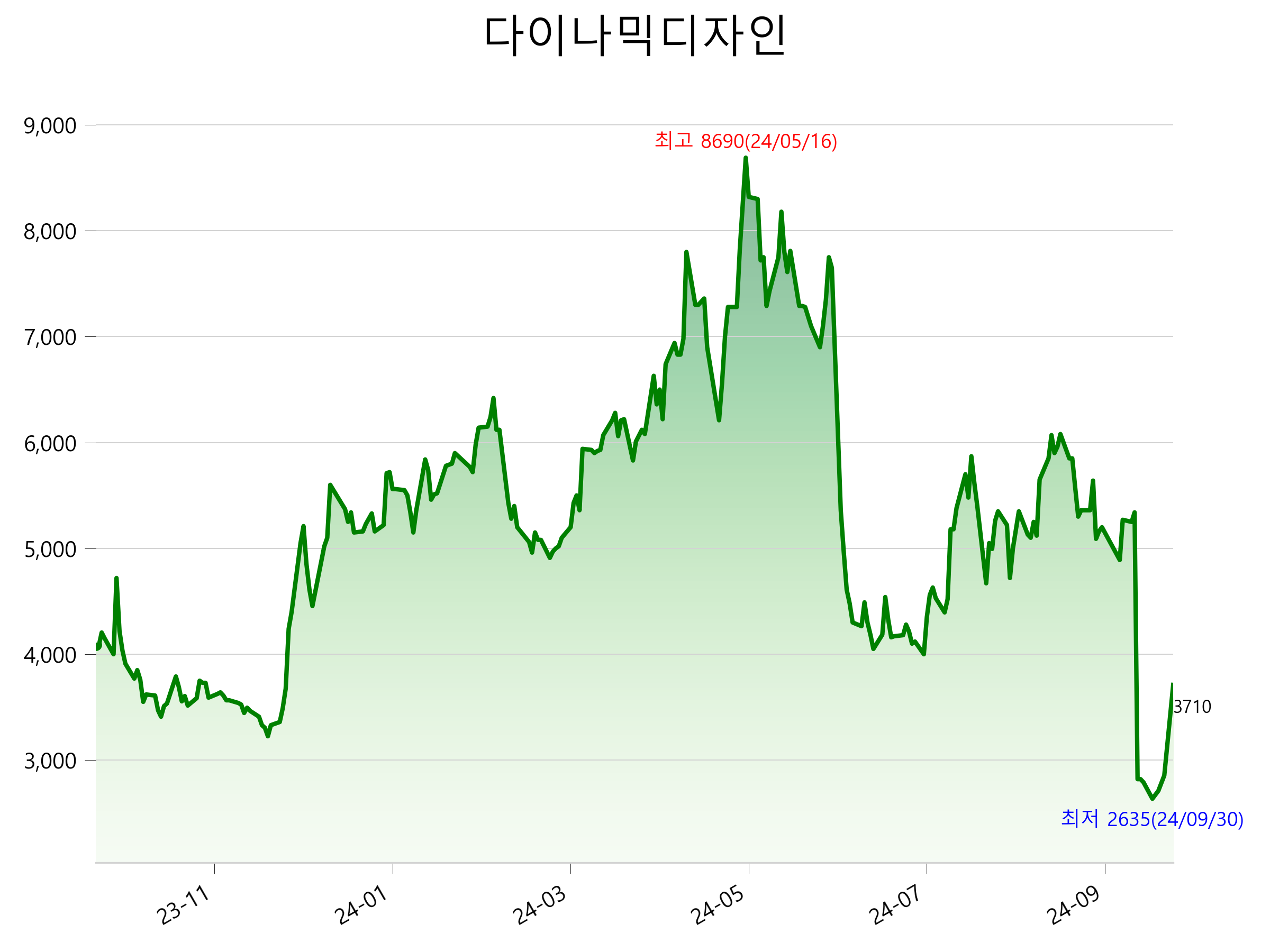 52주 최고가는 8,690원(2024-05-16), 52주 최저가는 2,635원(2024-09-30)으로 52주간 주가 상승률은 -9.3% 입니다.
